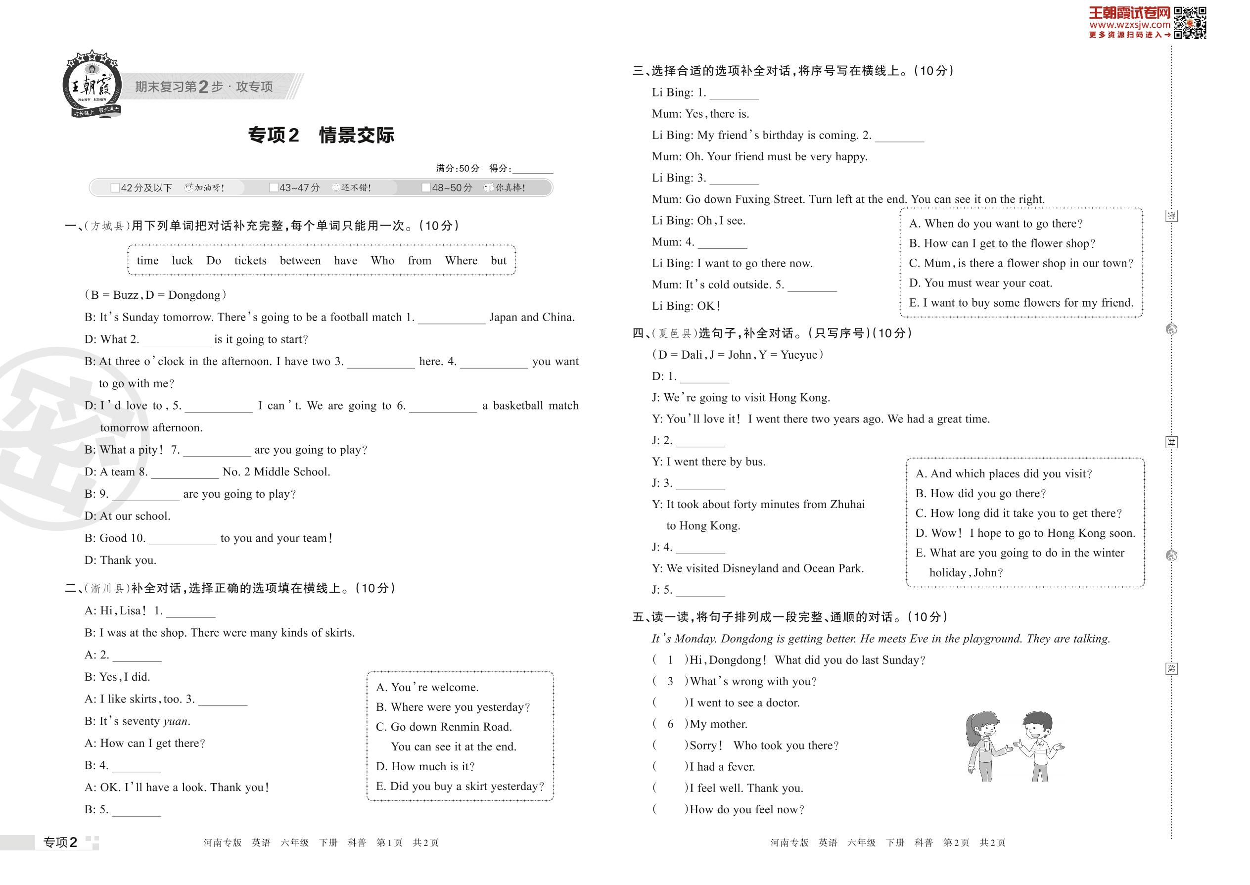 王朝霞期末专项卷——情景交际六年级下册英语(科普版)_R230425173404380【2】