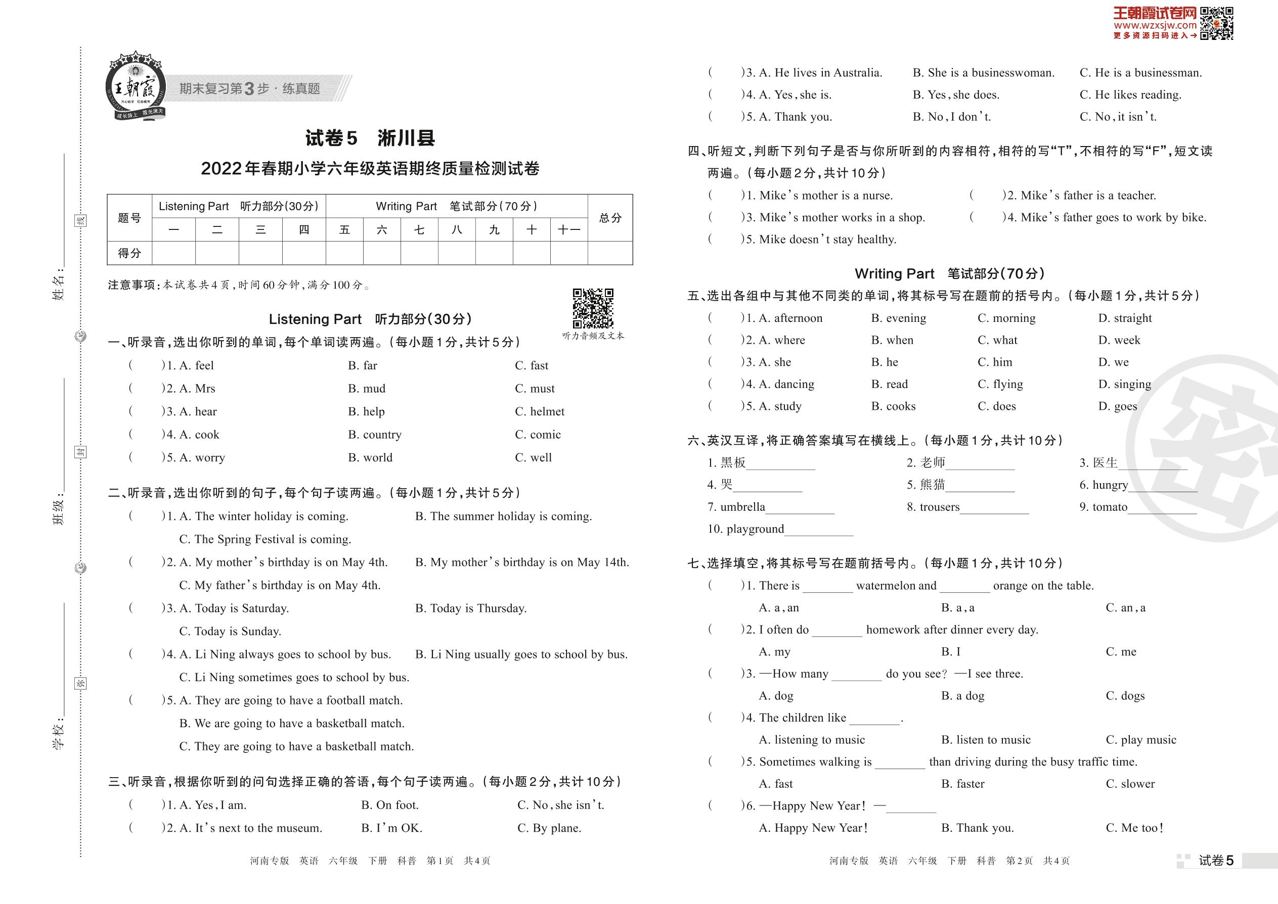 淅川县2022年春期小学六年级英语期终质量检测试卷(科普版)【5】