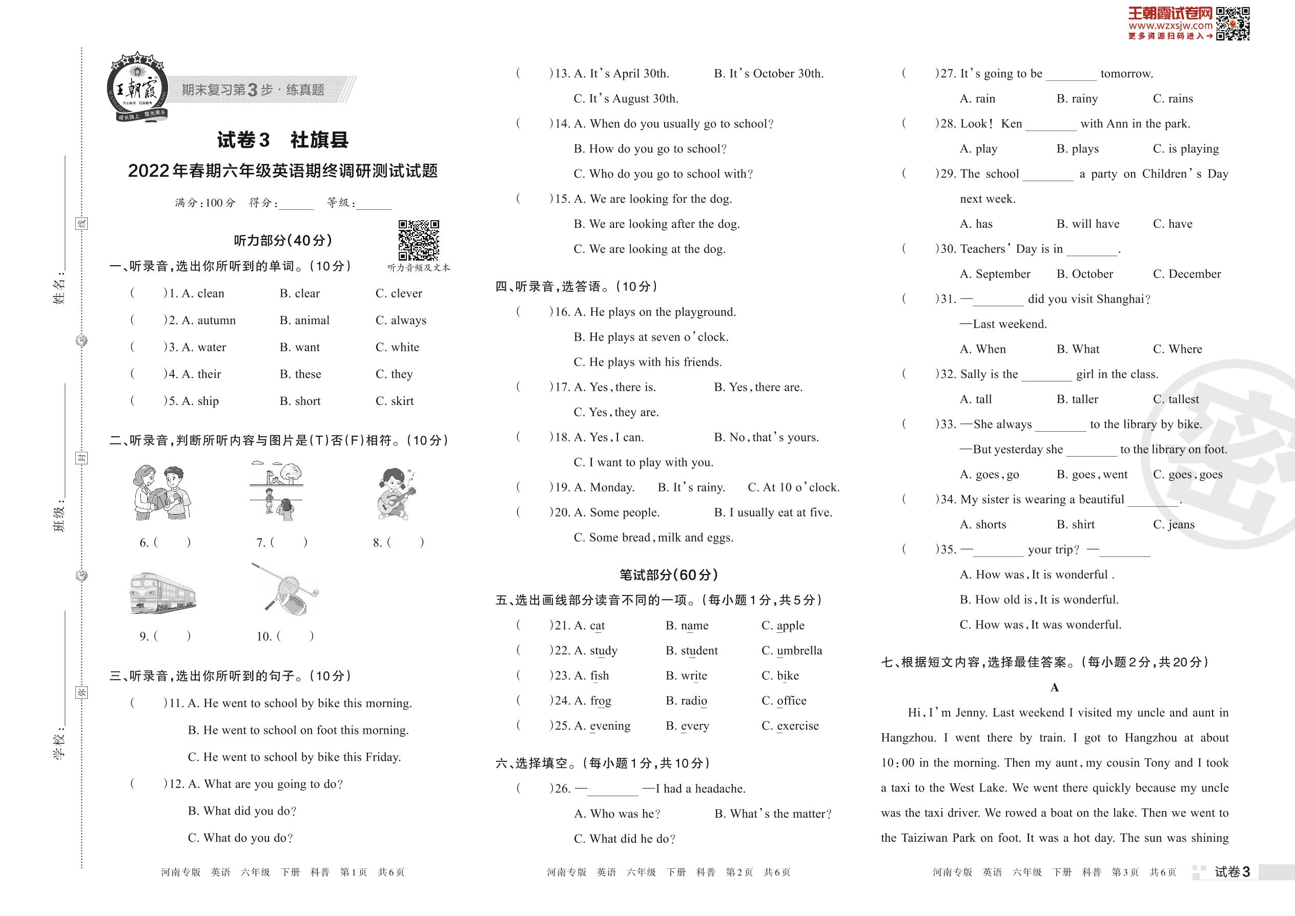 社旗县2022年春期六年级英语期终调研测试试题(科普版)【3】