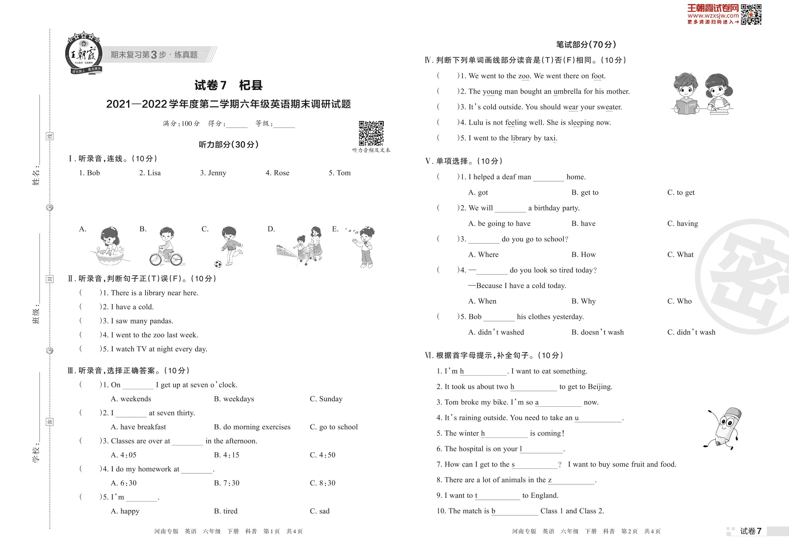 杞县2021—2022学年度第二学期六年级英语期末调研试题(科普版)【7】