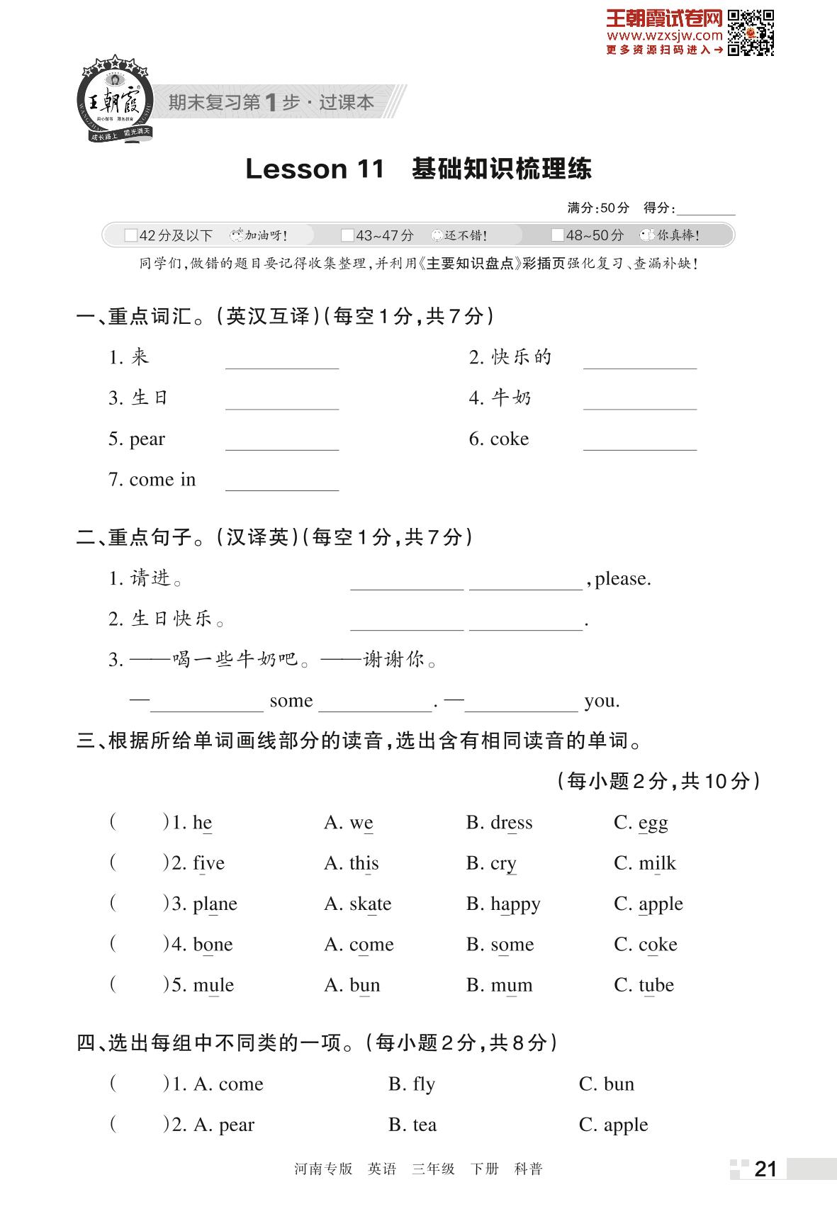 王朝霞期末过课本——Lesson 11 基础知识梳理练三年级下册英语(科普版)_R230426092846199