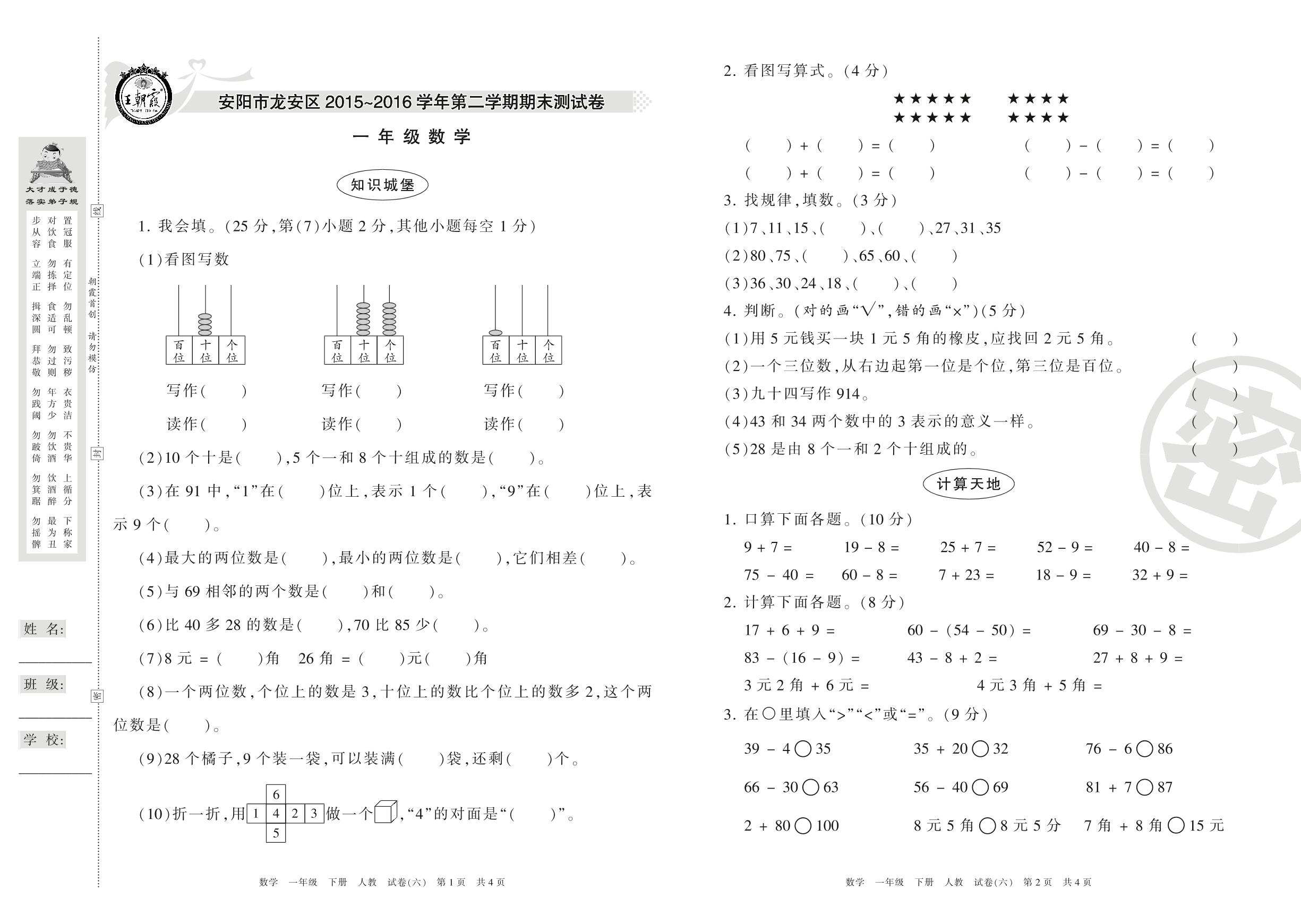 2015-2016学年第二学期安阳市龙安区一年级数学试卷(人教版)【6】