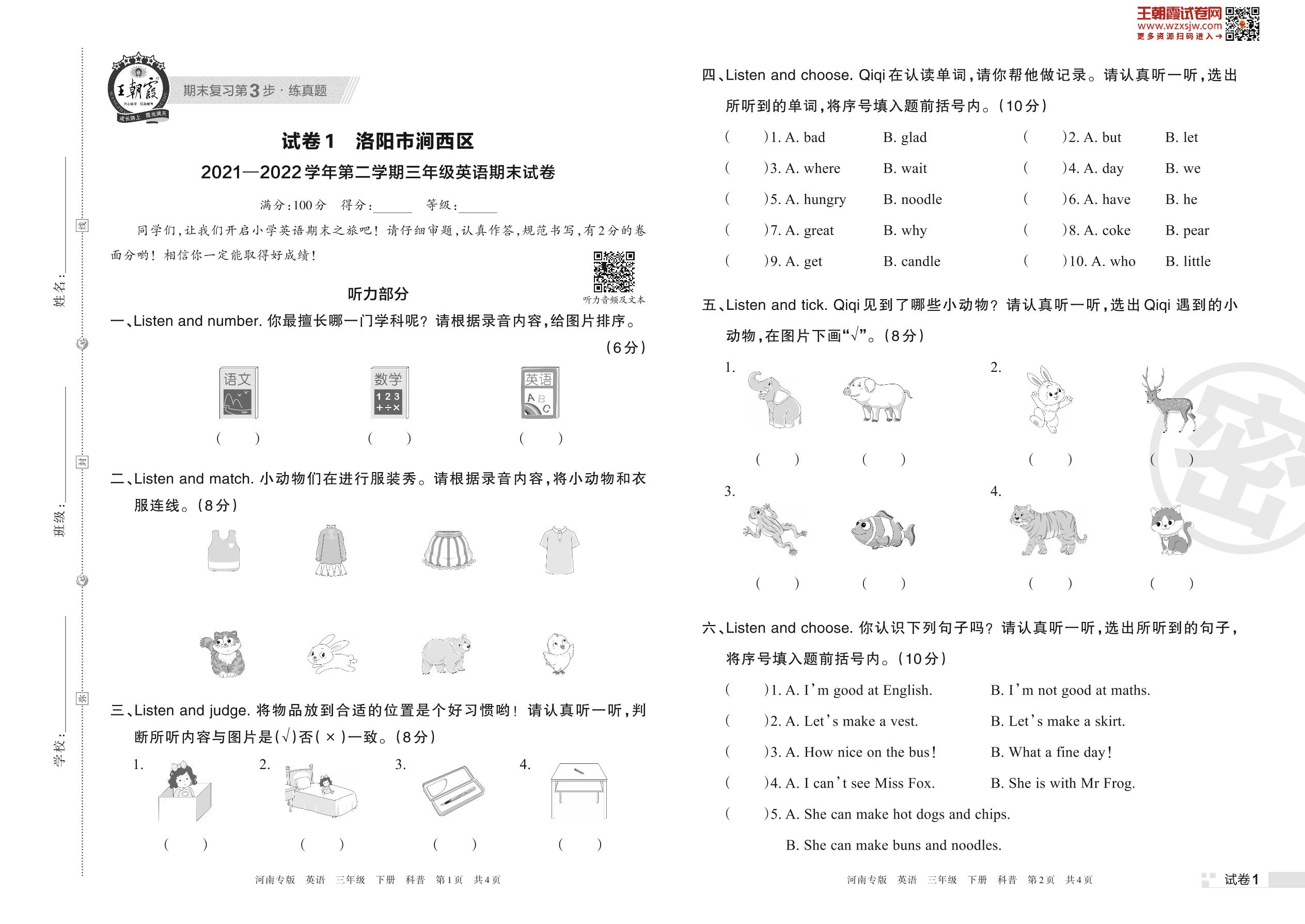洛阳市涧西区2021—2022学年第二学期三年级英语期末试卷(科普版)【1】