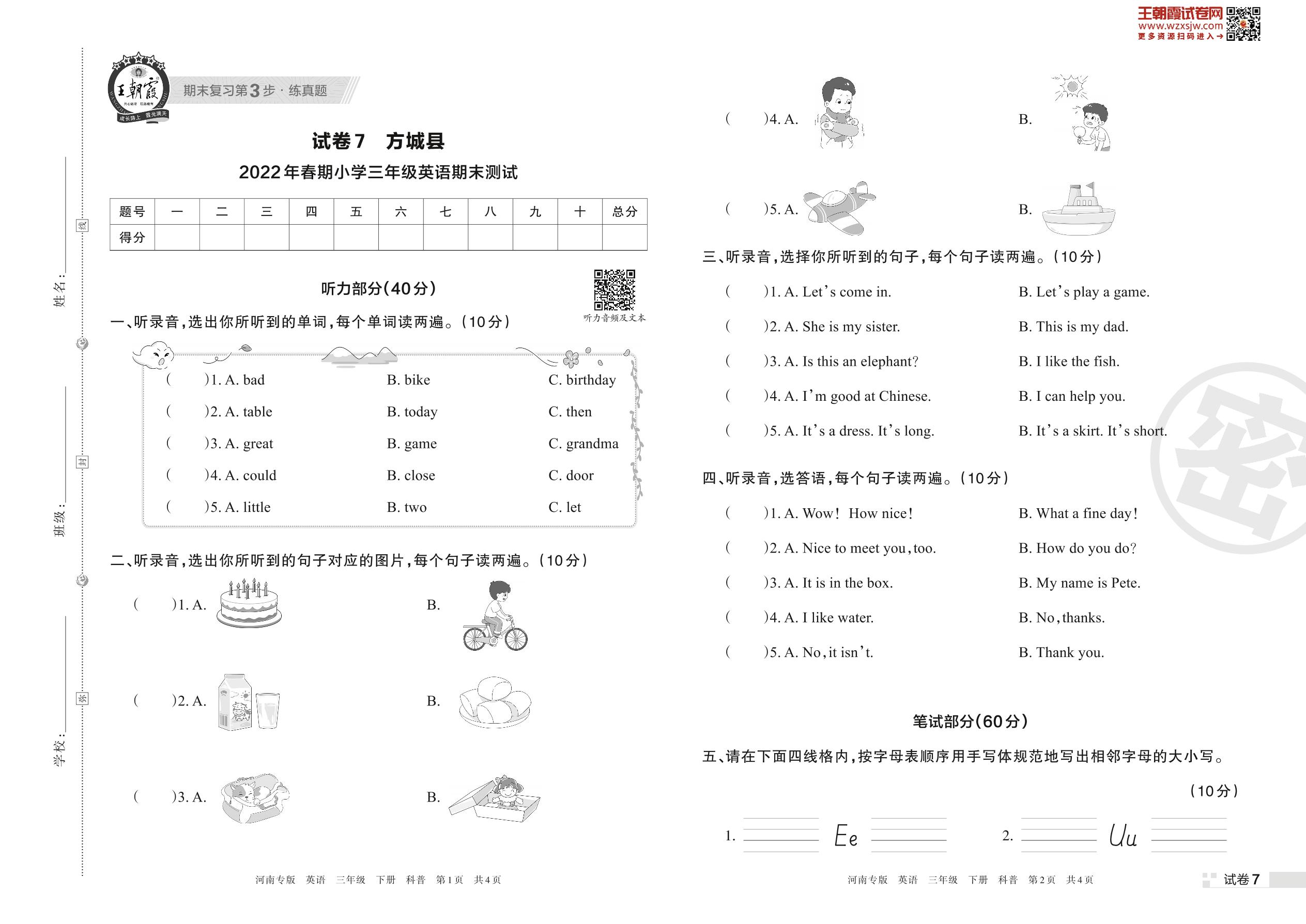 方城县2022年春期小学三年级英语期末测试(科普版)【7】