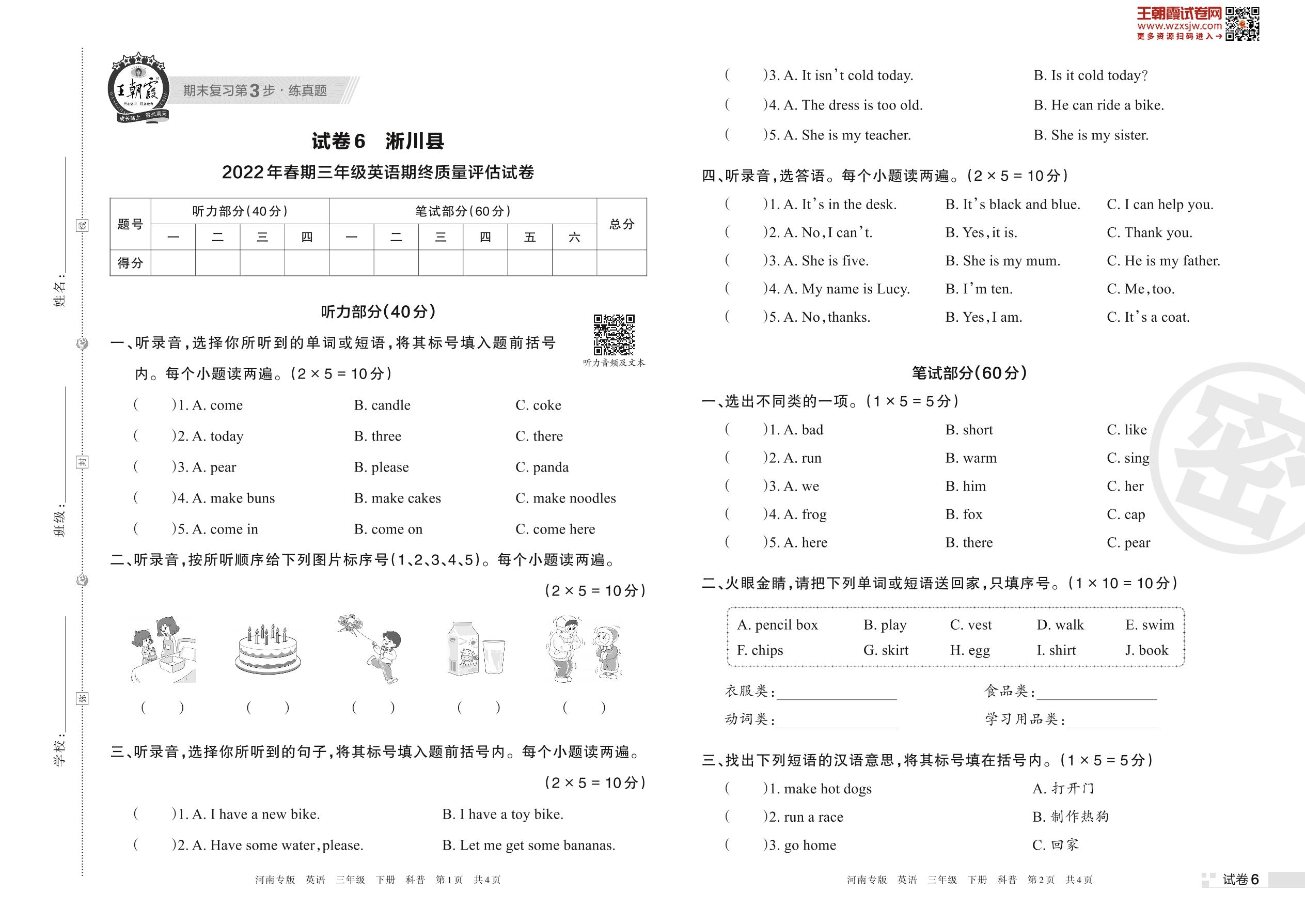 淅川县2022年春期三年级英语期终质量评估试卷(科普版)【6】