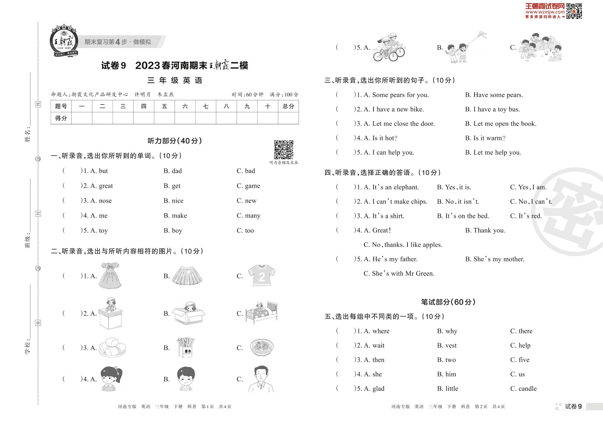 王朝霞期末模拟卷三年级下册英语(科普版)【9】