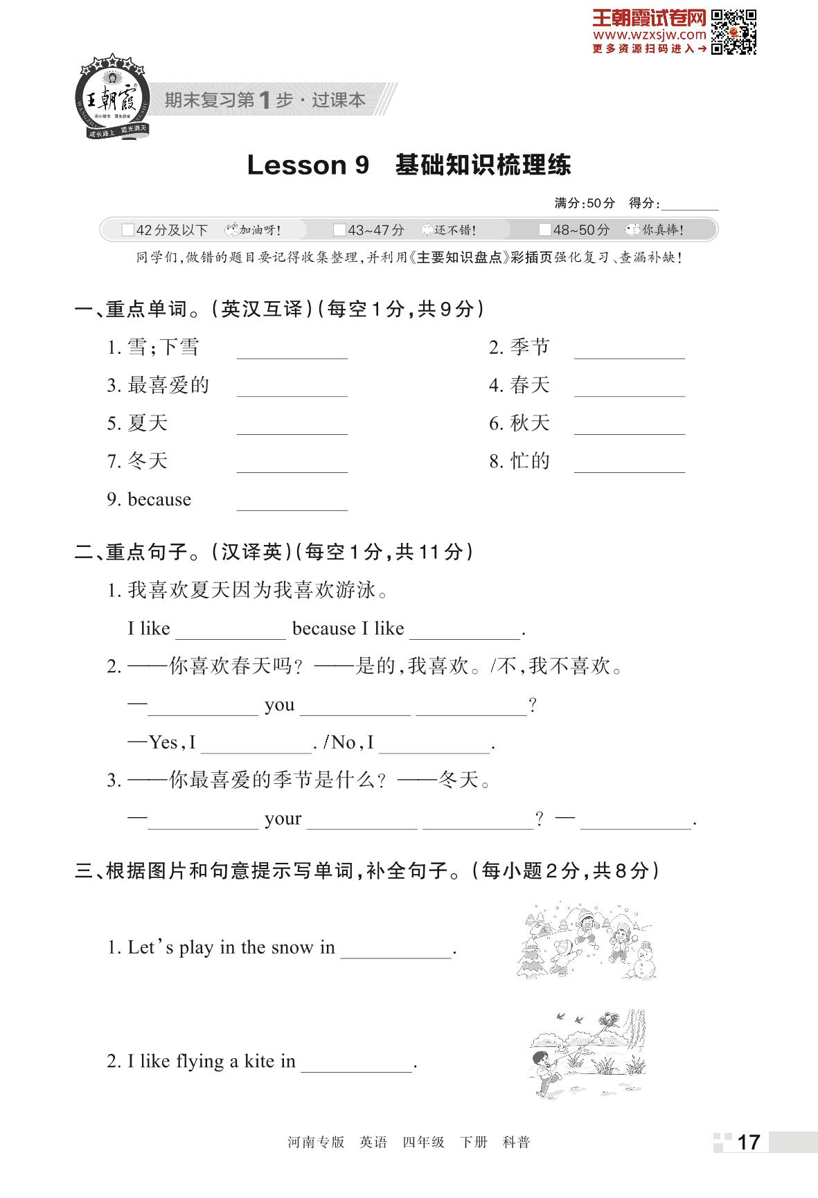 王朝霞期末过课本——Lesson 9 基础知识梳理练四年级下册英语(科普版)_R230426093453203