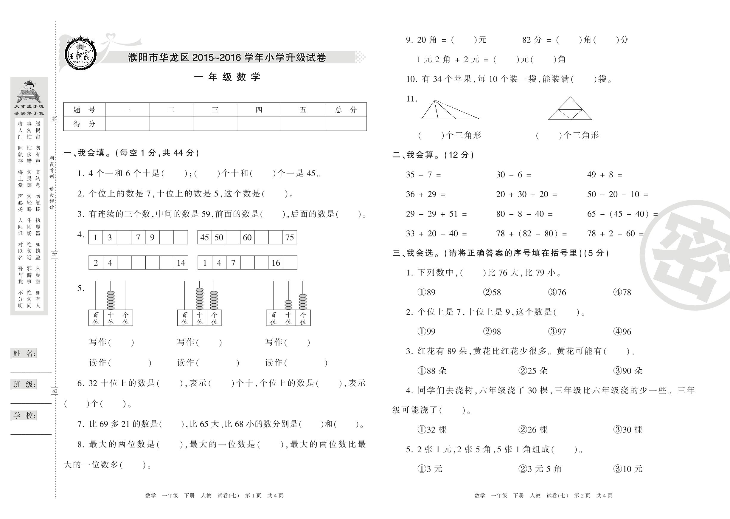 2015-2016学年第二学期濮阳市华龙区一年级数学试卷(人教版)【7】