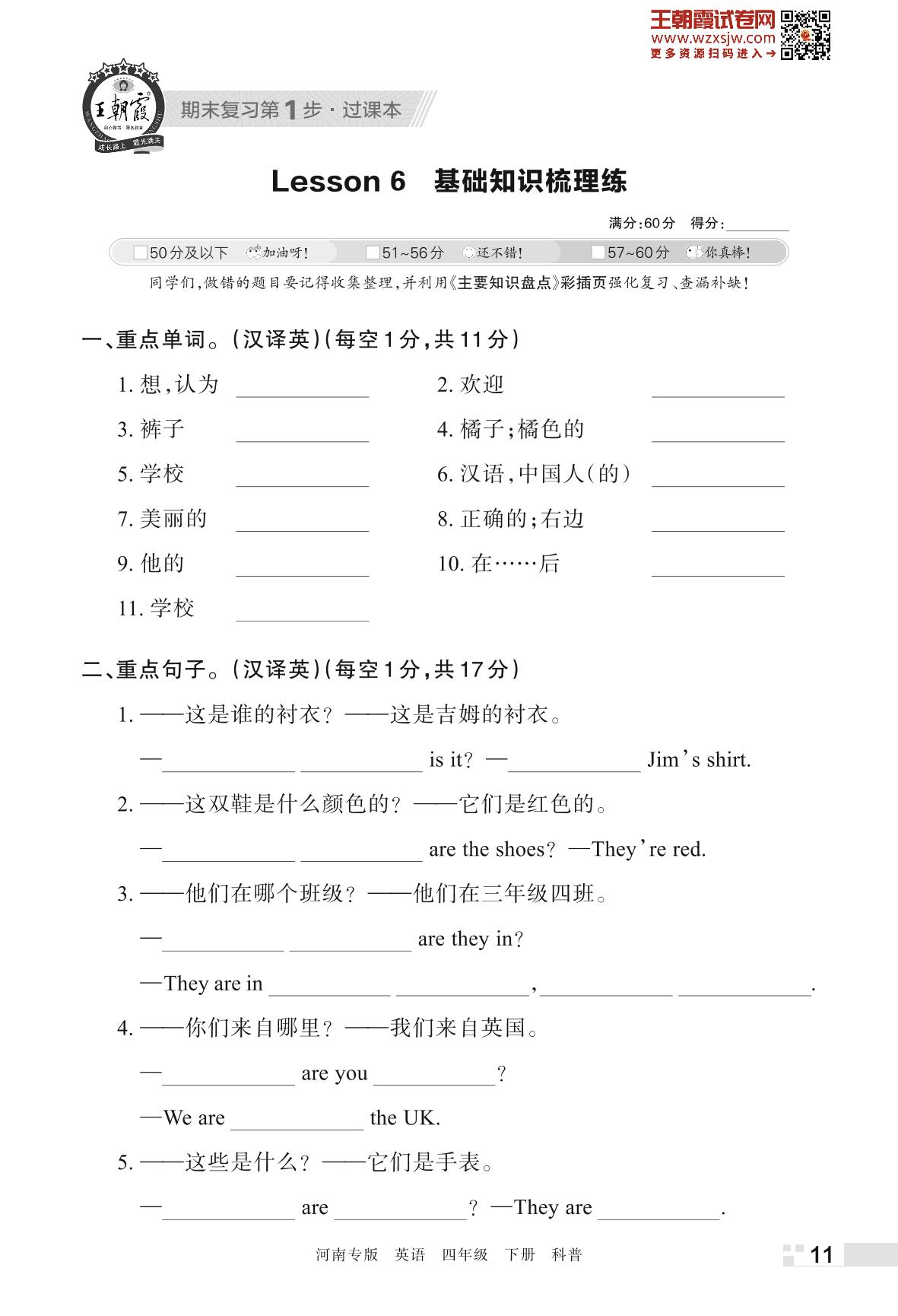 王朝霞期末过课本——Lesson 6 基础知识梳理练四年级下册英语(科普版)_R230426093453540