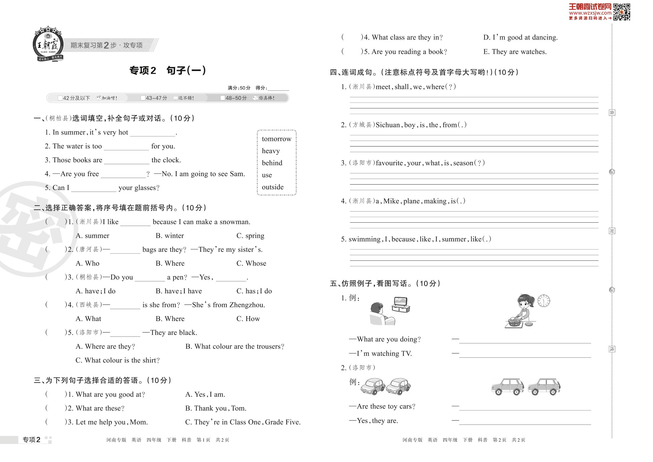 王朝霞期末专项卷——句子(一)四年级下册英语(科普版)【2】