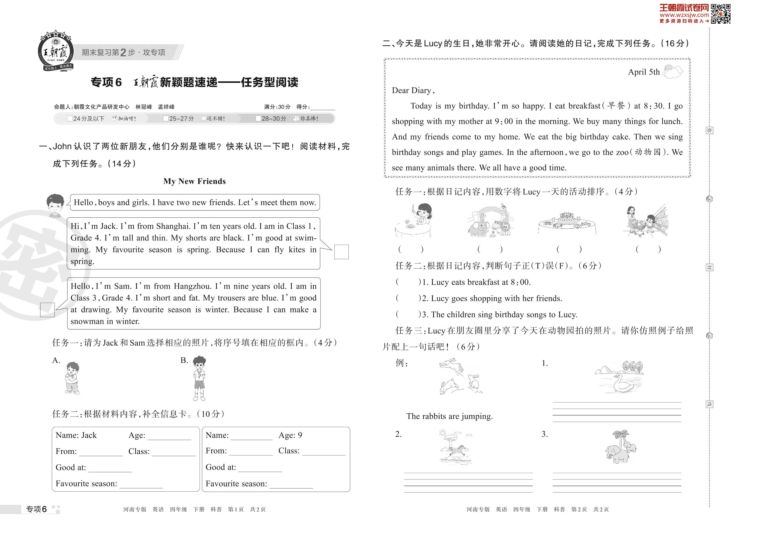 王朝霞期末专项卷——新颖题速递:任务型阅读四年级下册英语(科普版)_R230426093454476【6】