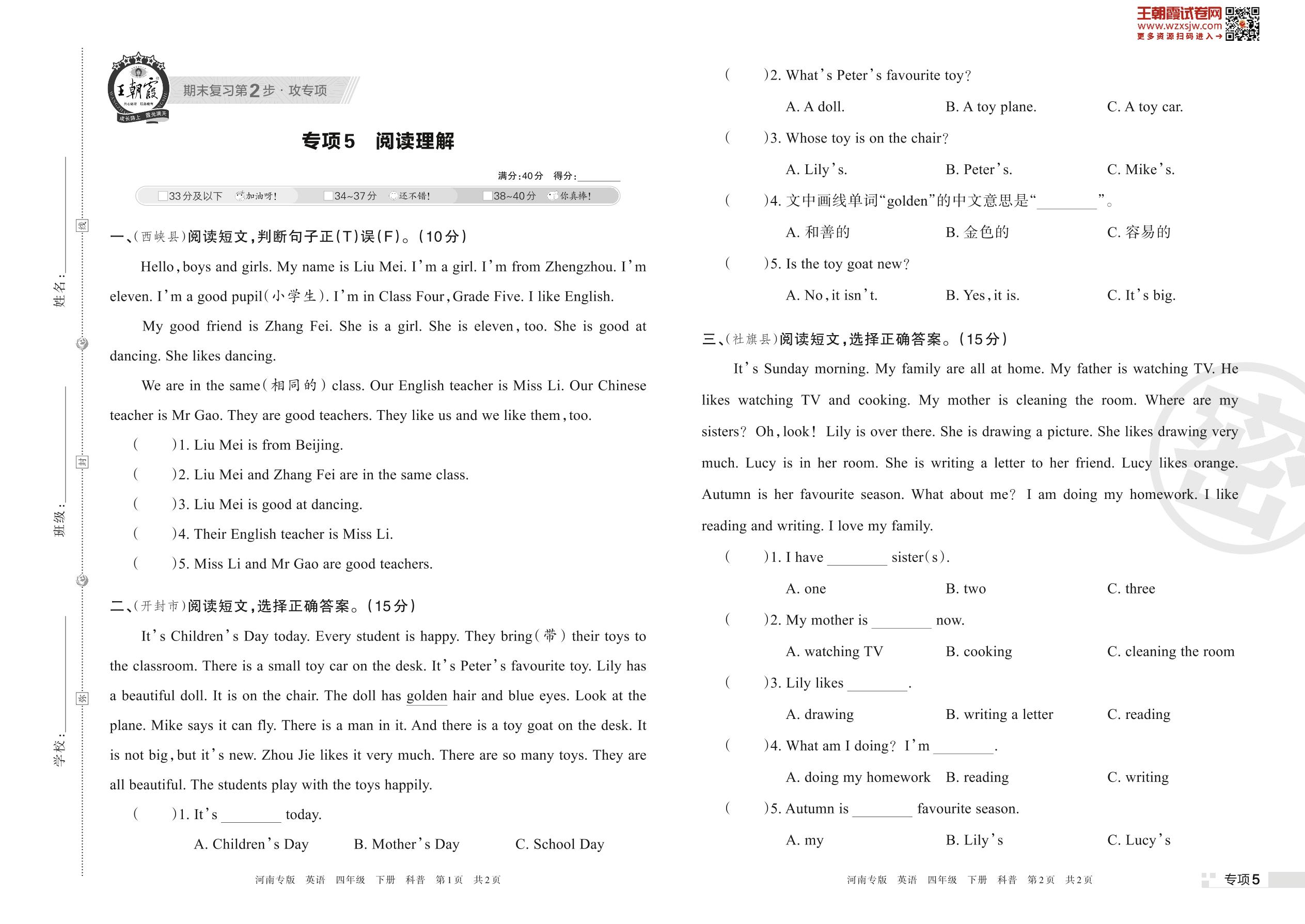王朝霞期末专项卷——阅读理解四年级下册英语(科普版)_R230426093454396【5】