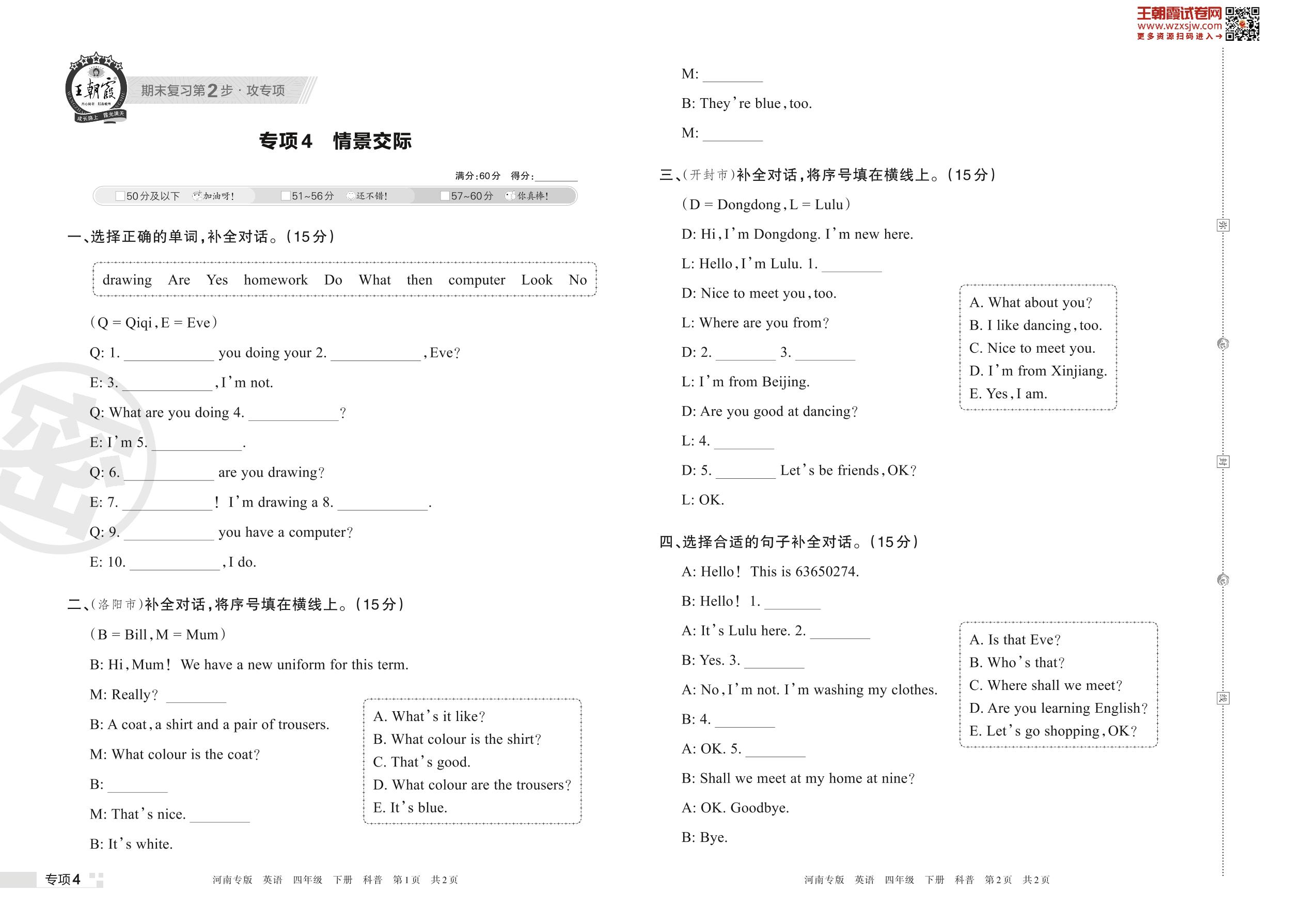 王朝霞期末专项卷——情景交际四年级下册英语(科普版)【4】