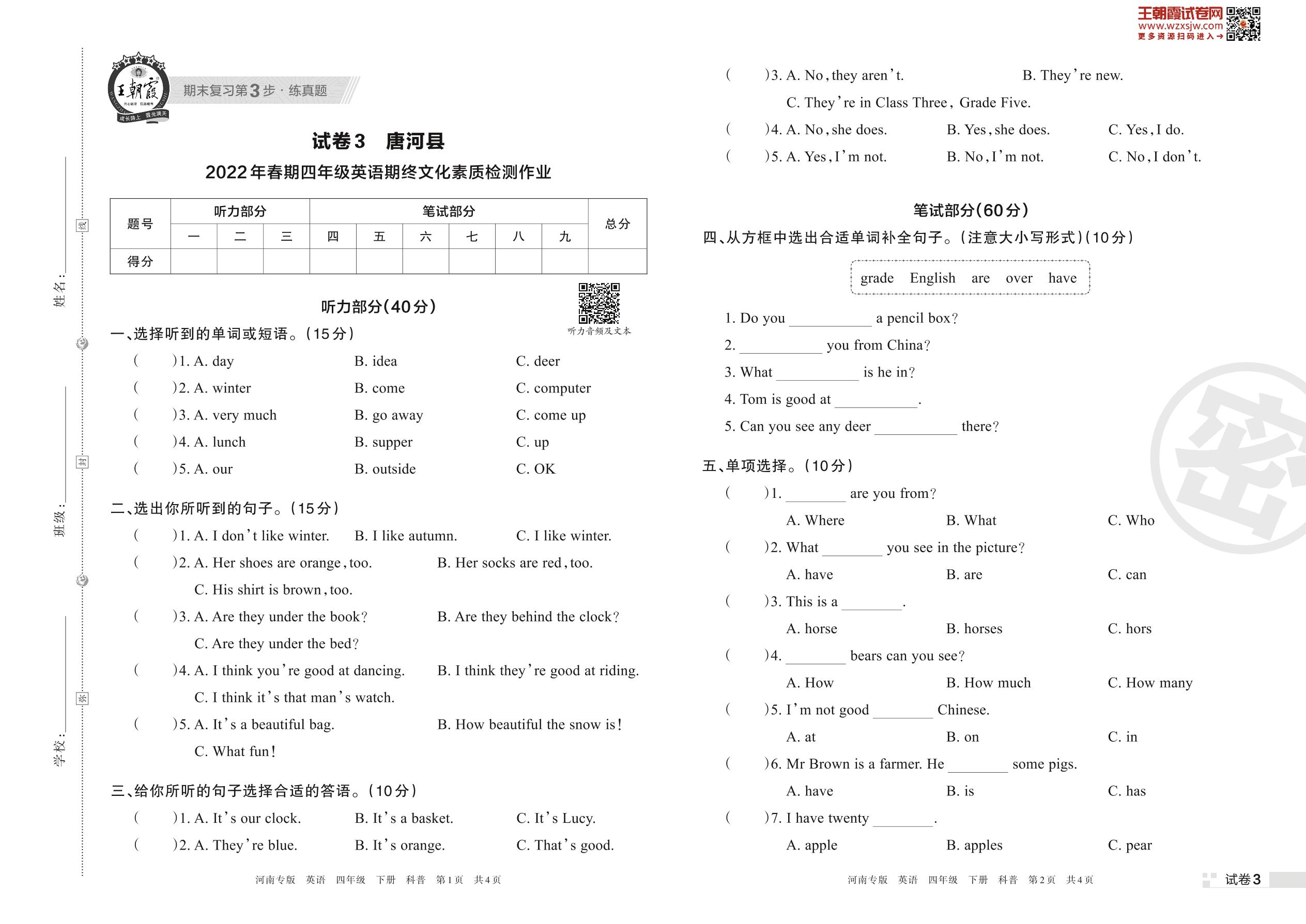 唐河县2022年春期四年级英语期终文化素质检测作业(科普版)【3】