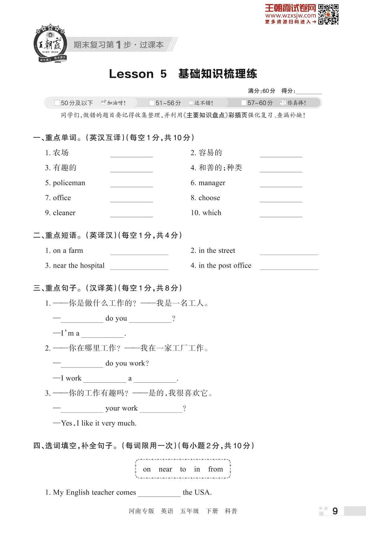 王朝霞期末过课本——Lesson 5 基础知识梳理练五年级下册英语(科普版)_R230426094313857