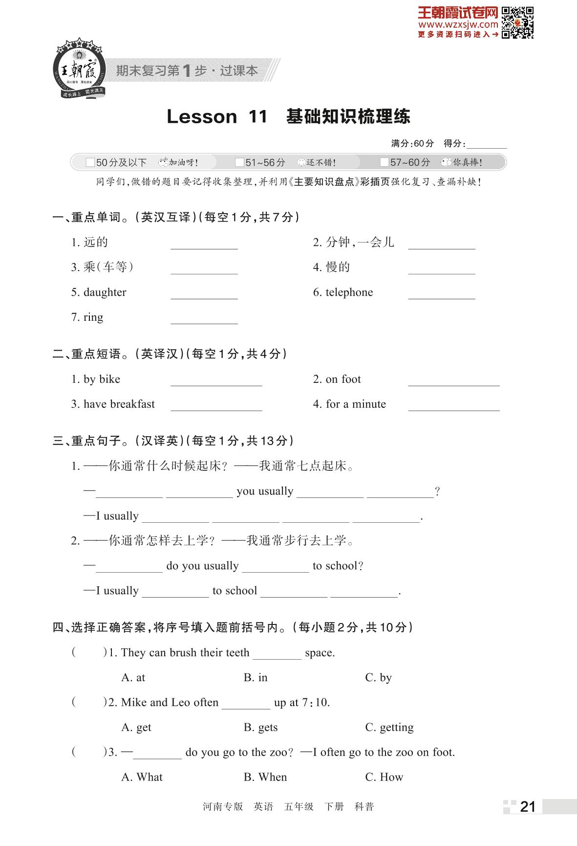 王朝霞期末过课本——Lesson 11 基础知识梳理练五年级下册英语(科普版)_R230426094314548