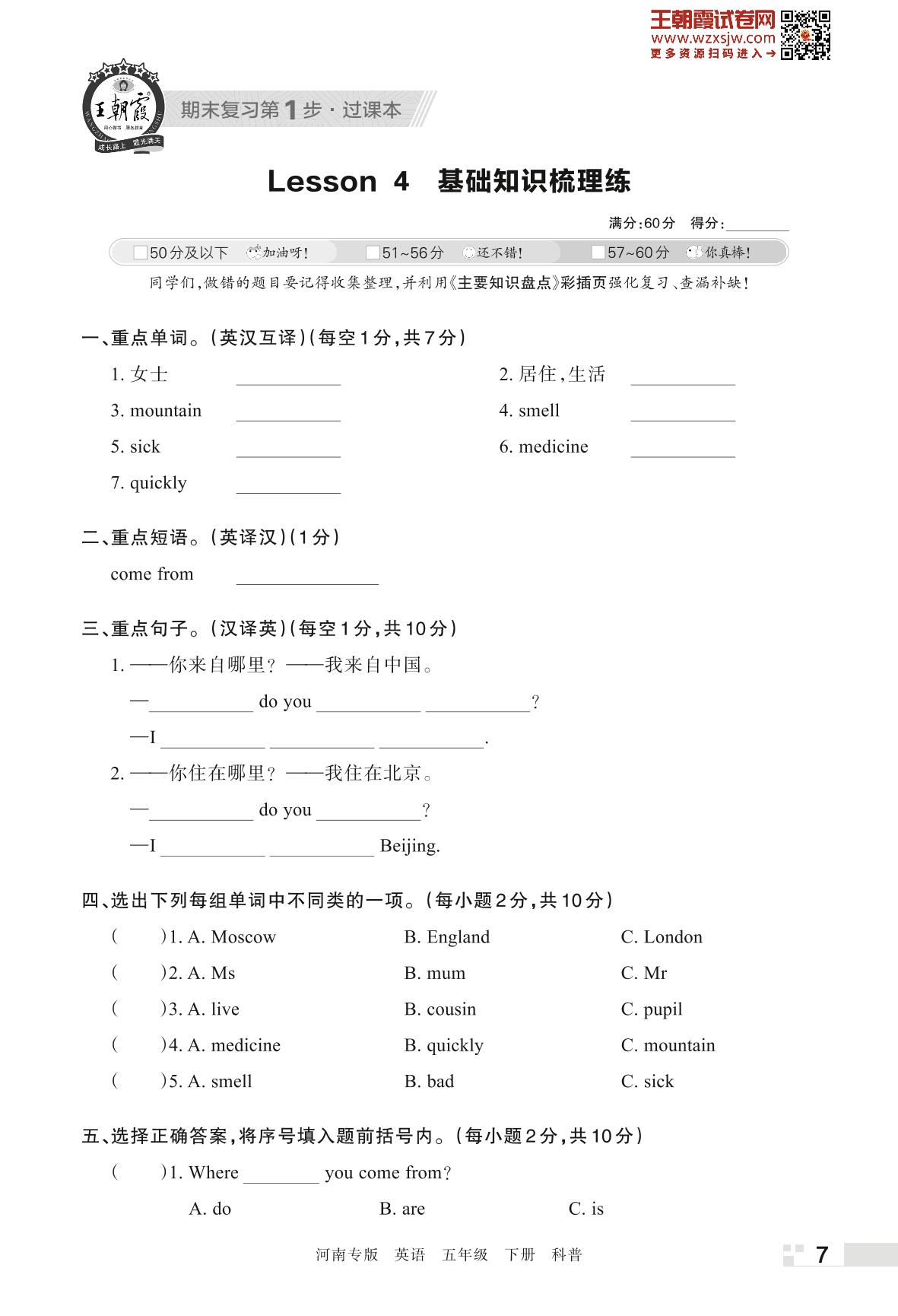 王朝霞期末过课本——Lesson 4 基础知识梳理练五年级下册英语(科普版)_R230426094314577