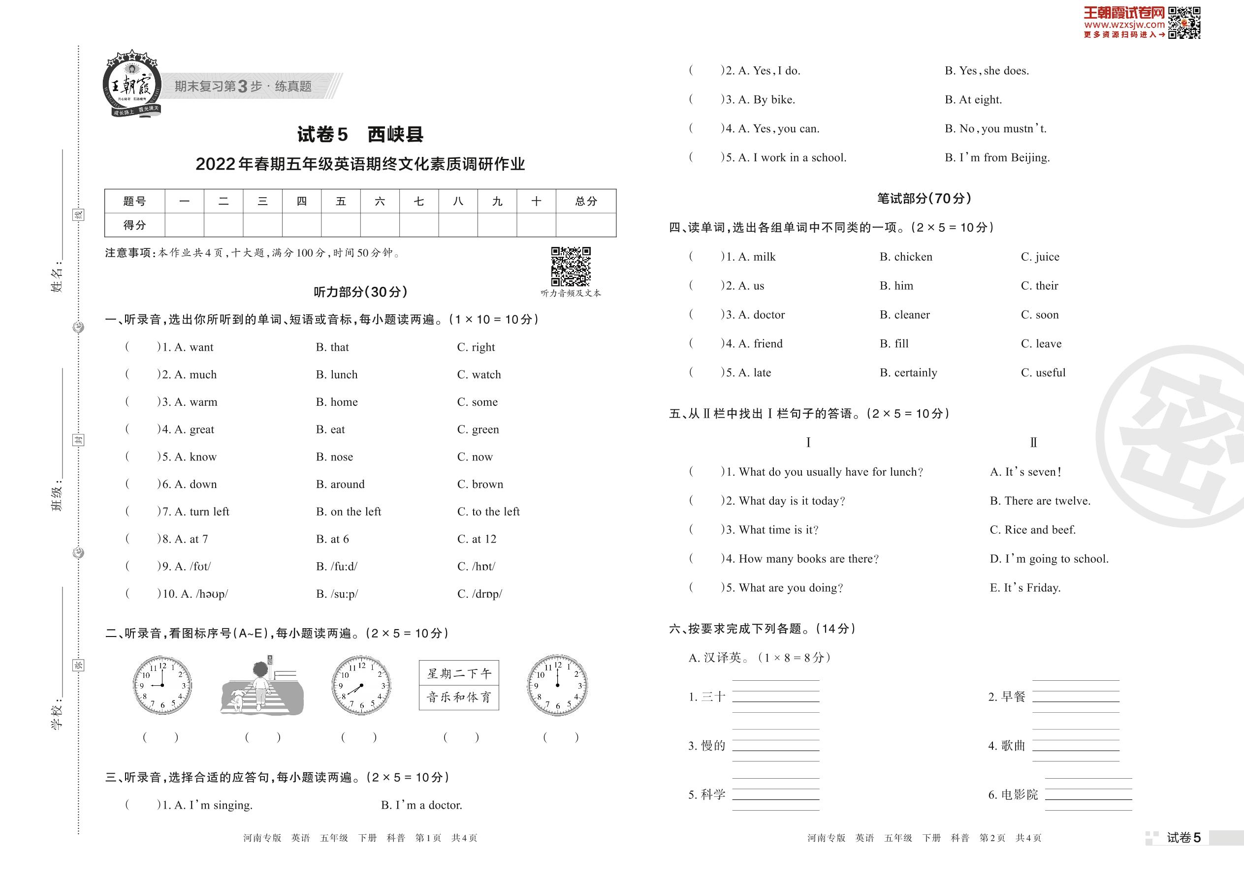 西峡县2022年春期五年级英语期终文化素质调研作业(科普版)【5】