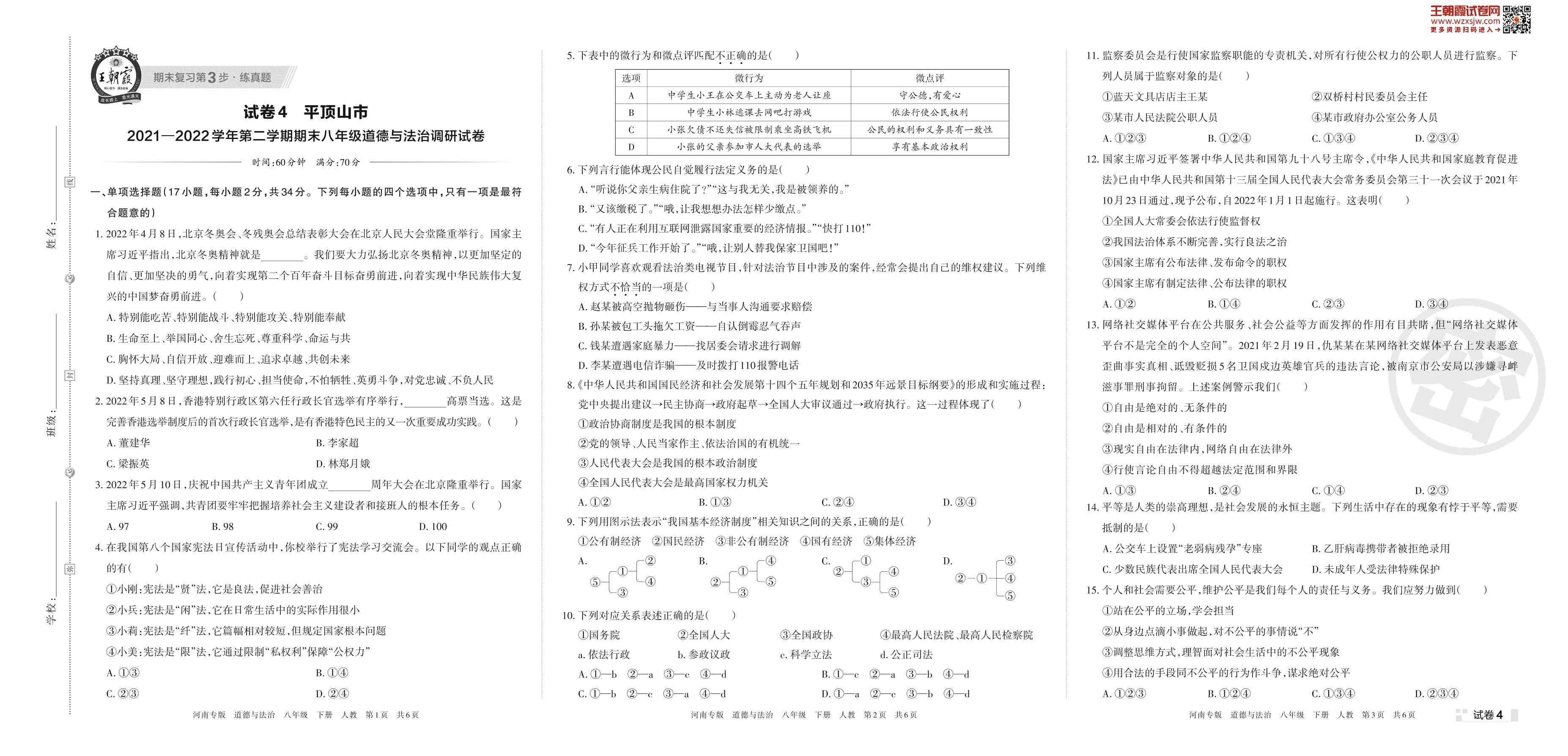 平顶山市2021—2022学年第二学期期末八年级道德与法治调研试卷(人教版)【4】