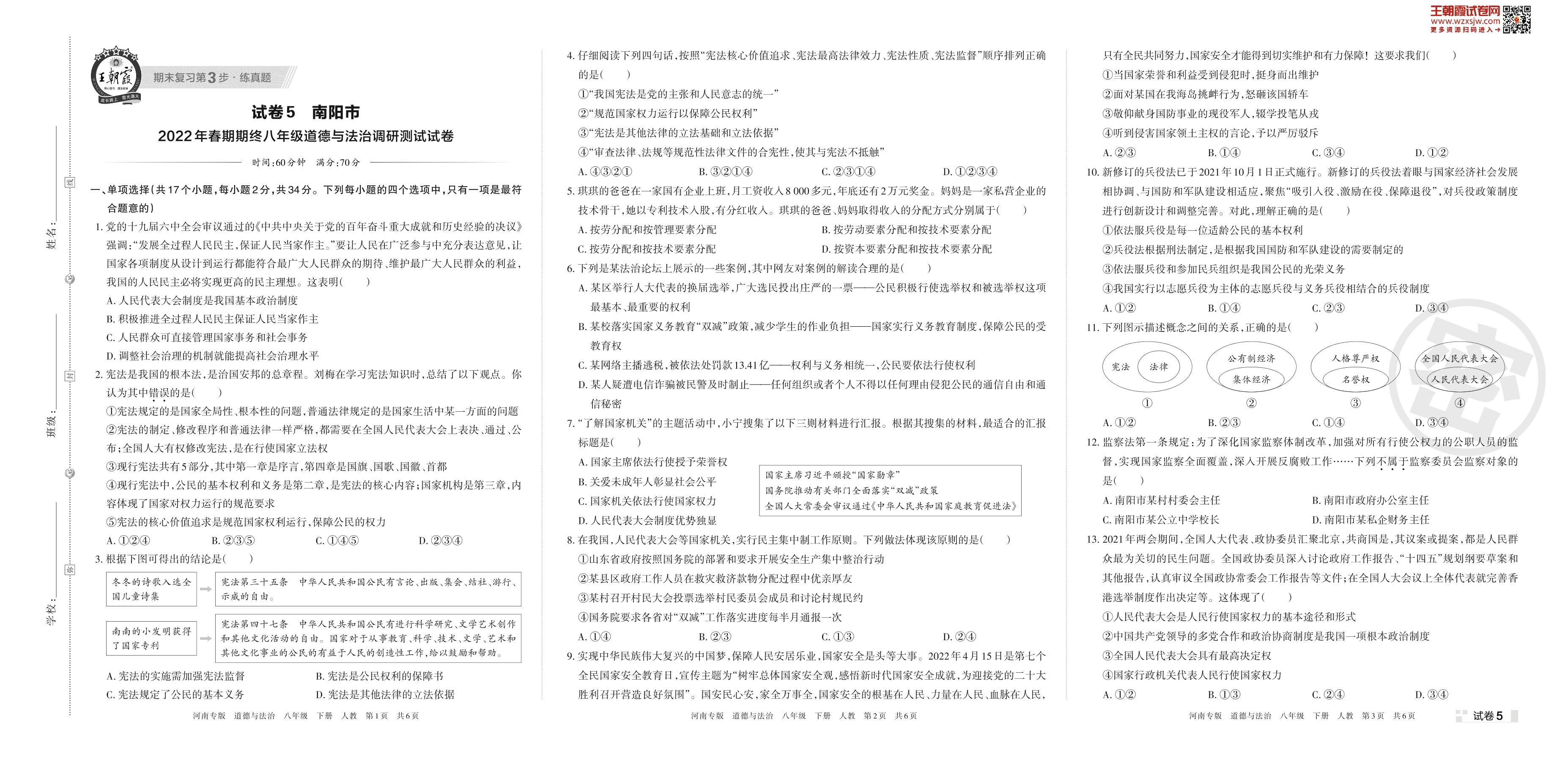 南阳市2022年春期期终八年级道德与法治调研测试试卷(人教版)【5】