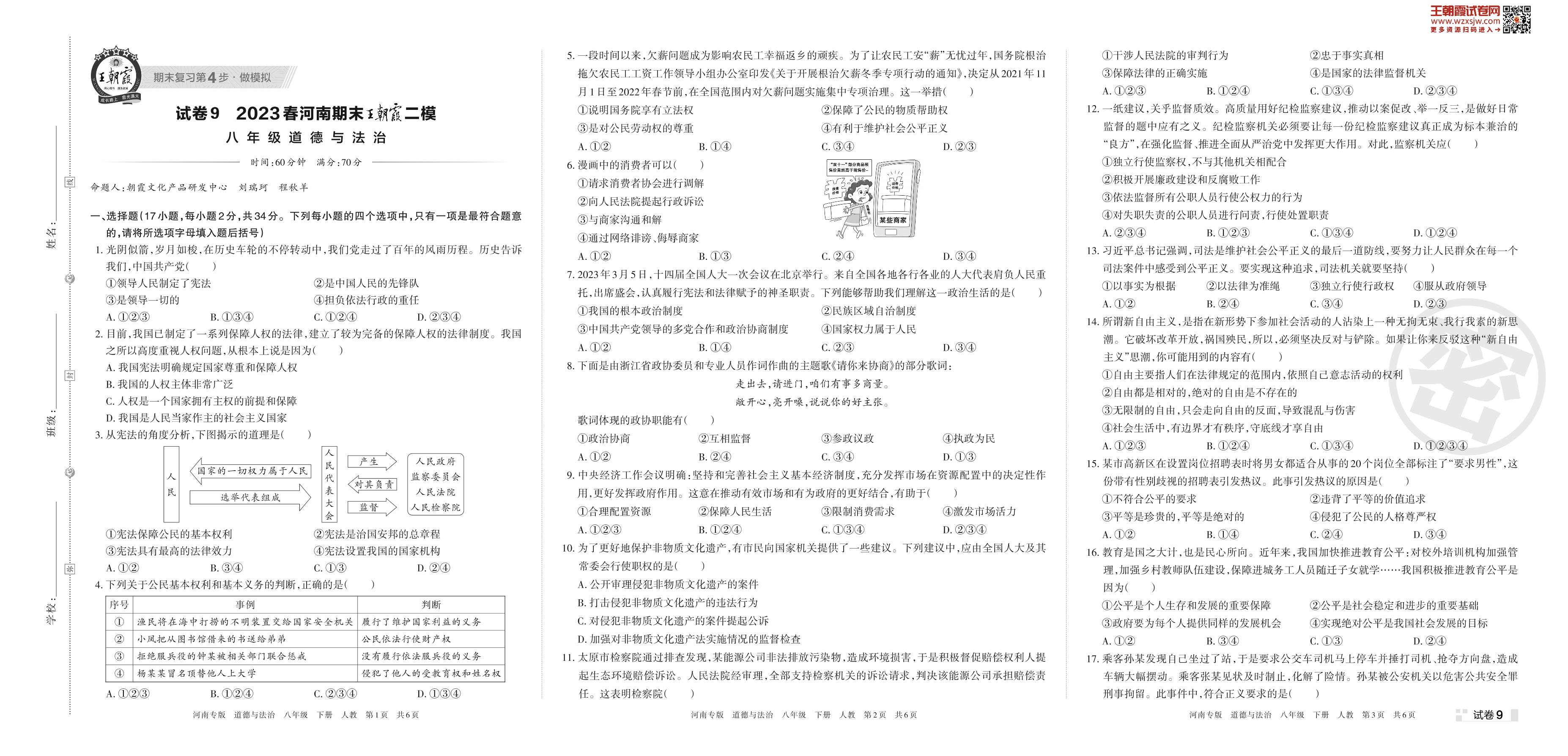 王朝霞期末模拟卷八年级下册道德与法治(人教版)【9】