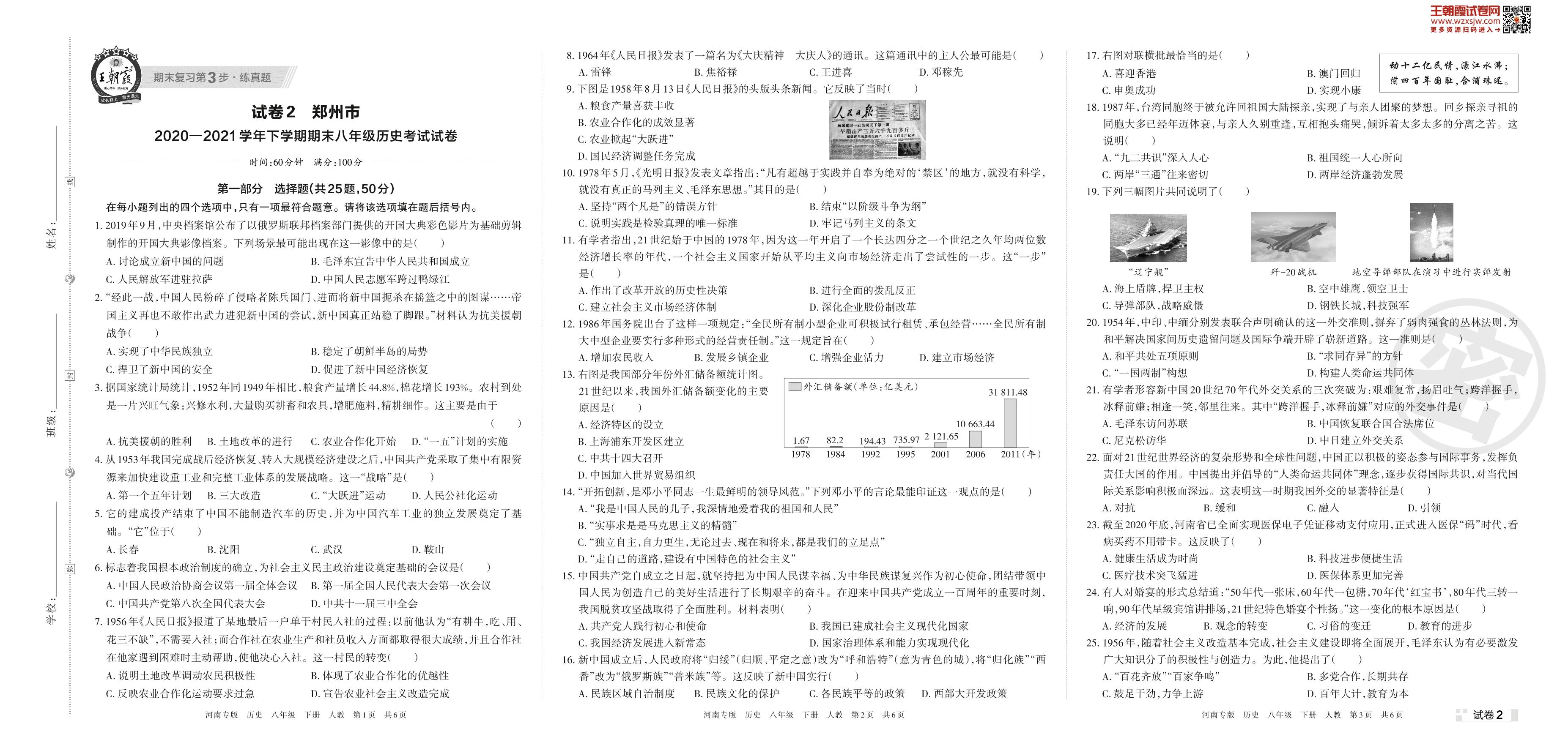 郑州市2020—2021学年下学期期末八年级历史考试试卷(人教版)【2】