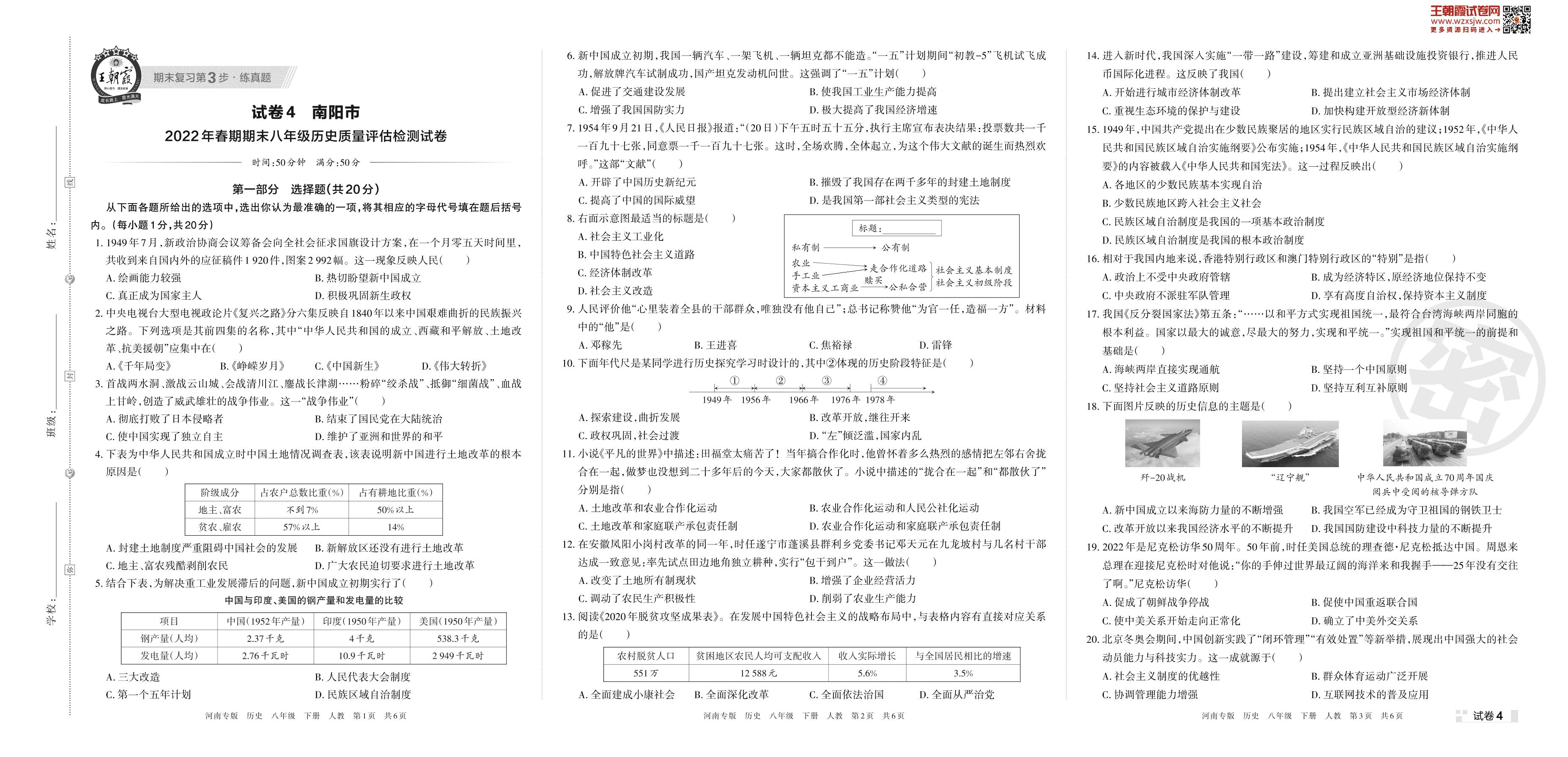 南阳市2022年春期期末八年级历史质量评估检测试卷(人教版)【4】
