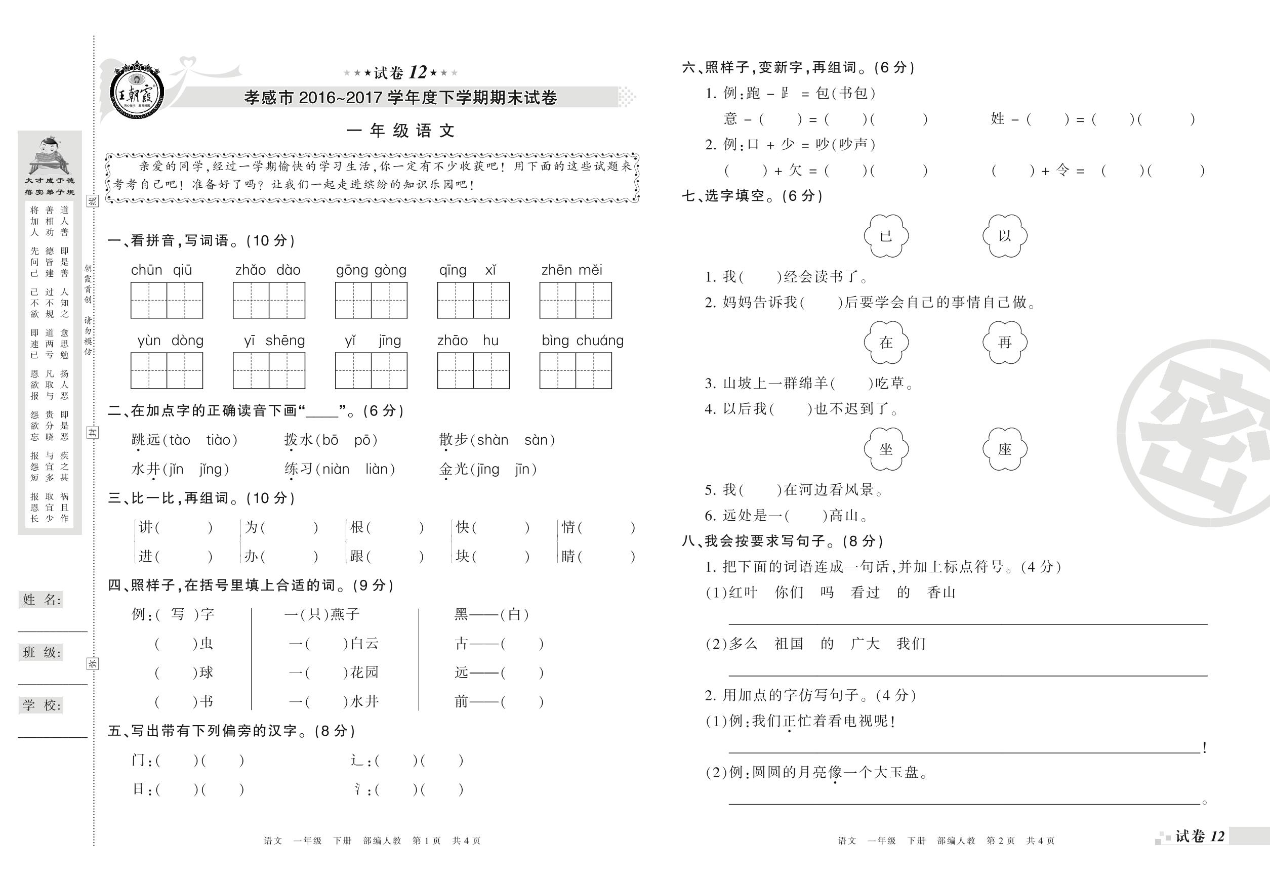 2016-2017学年第二学期孝感市一年级语文试卷(人教版)【12】