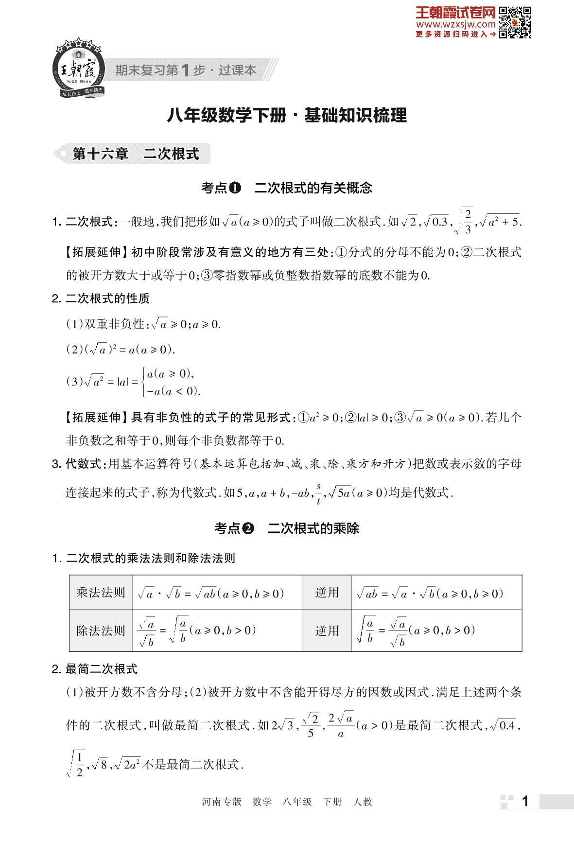 王朝霞期末知识梳理——第十六章 二次根式八年级下册数学(人教版)_R230426100130574