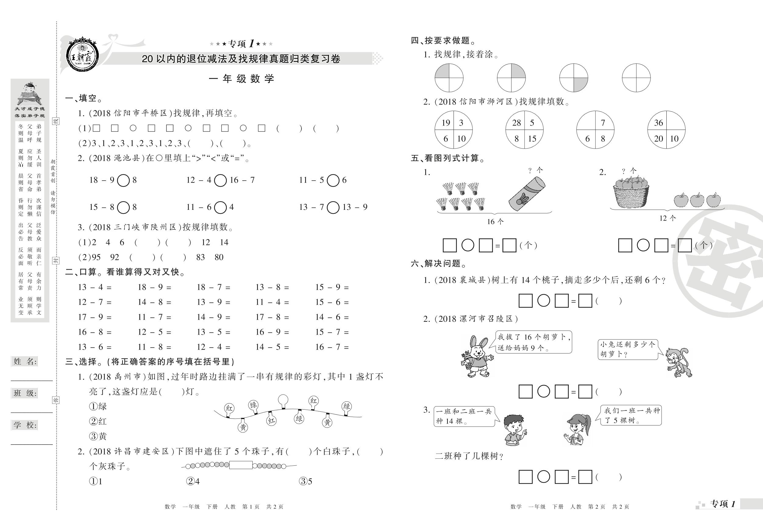 王朝霞期末专项卷——20以内的退位减法及找规律、100以内数的认识(一)真题归类复习卷一年级下册数学(人教版)_R210802221205【0】