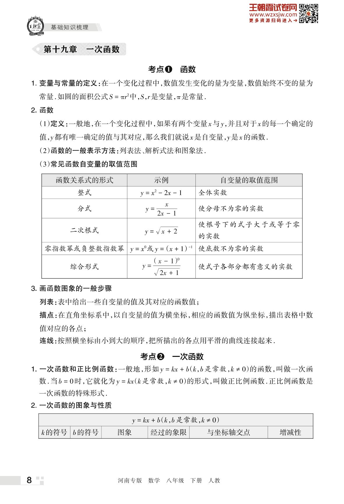 王朝霞期末知识梳理——第十九章 一次函数八年级下册数学(人教版)_R230426100130104