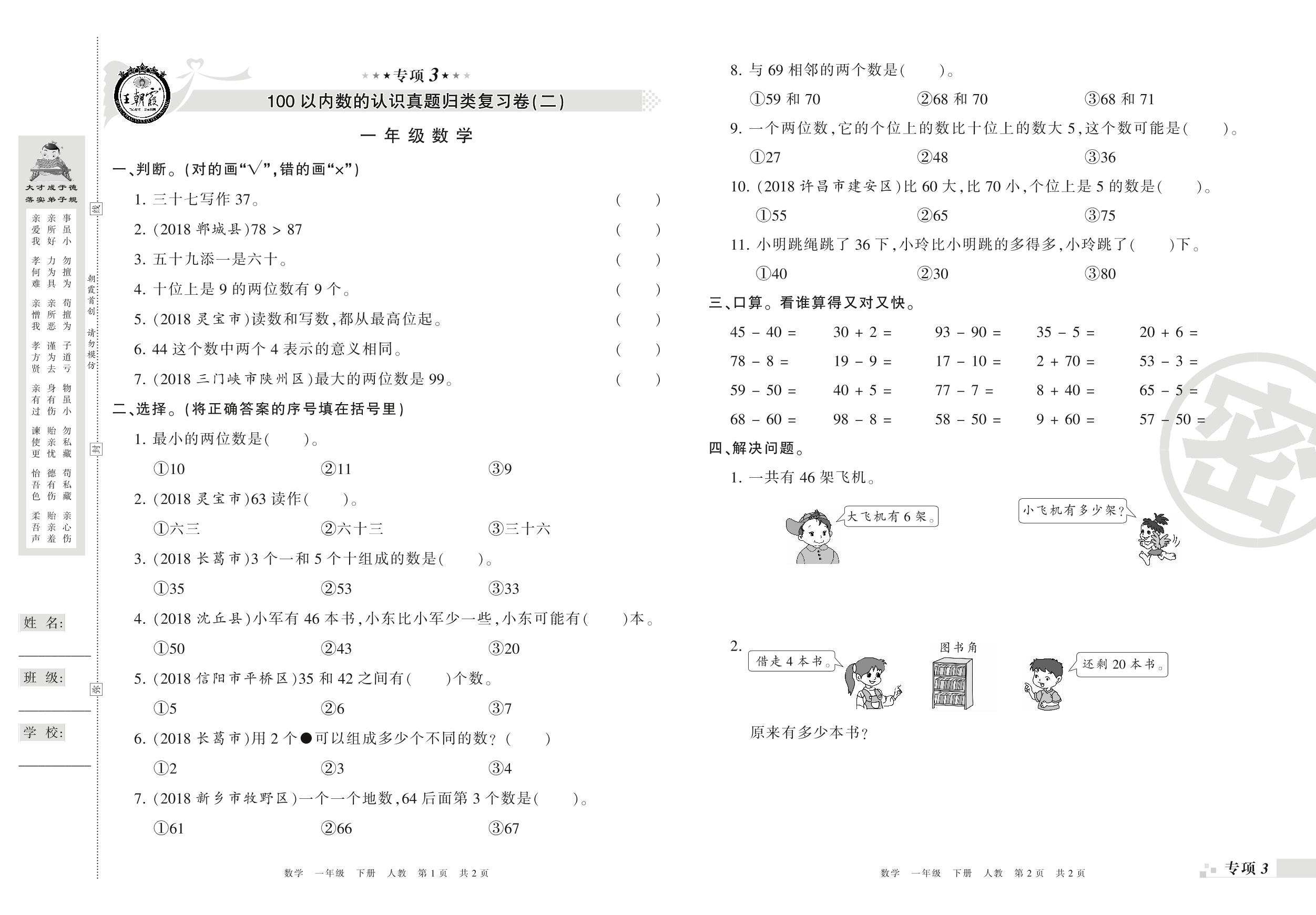 一年级数学人教版下册专项卷