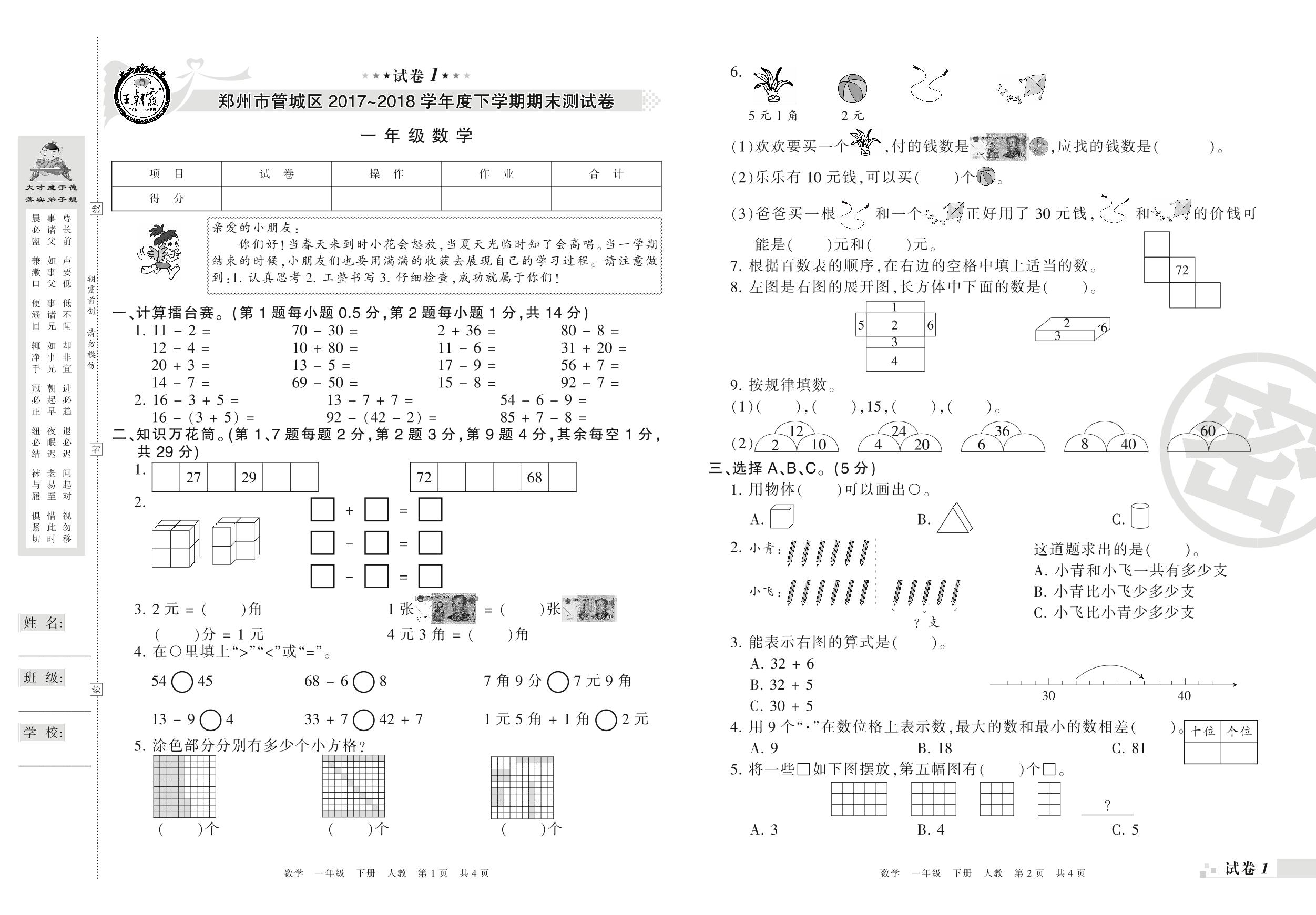 2017-2018学年第二学期郑州市管城区一年级数学试卷(人教版)_R210802221220【1】