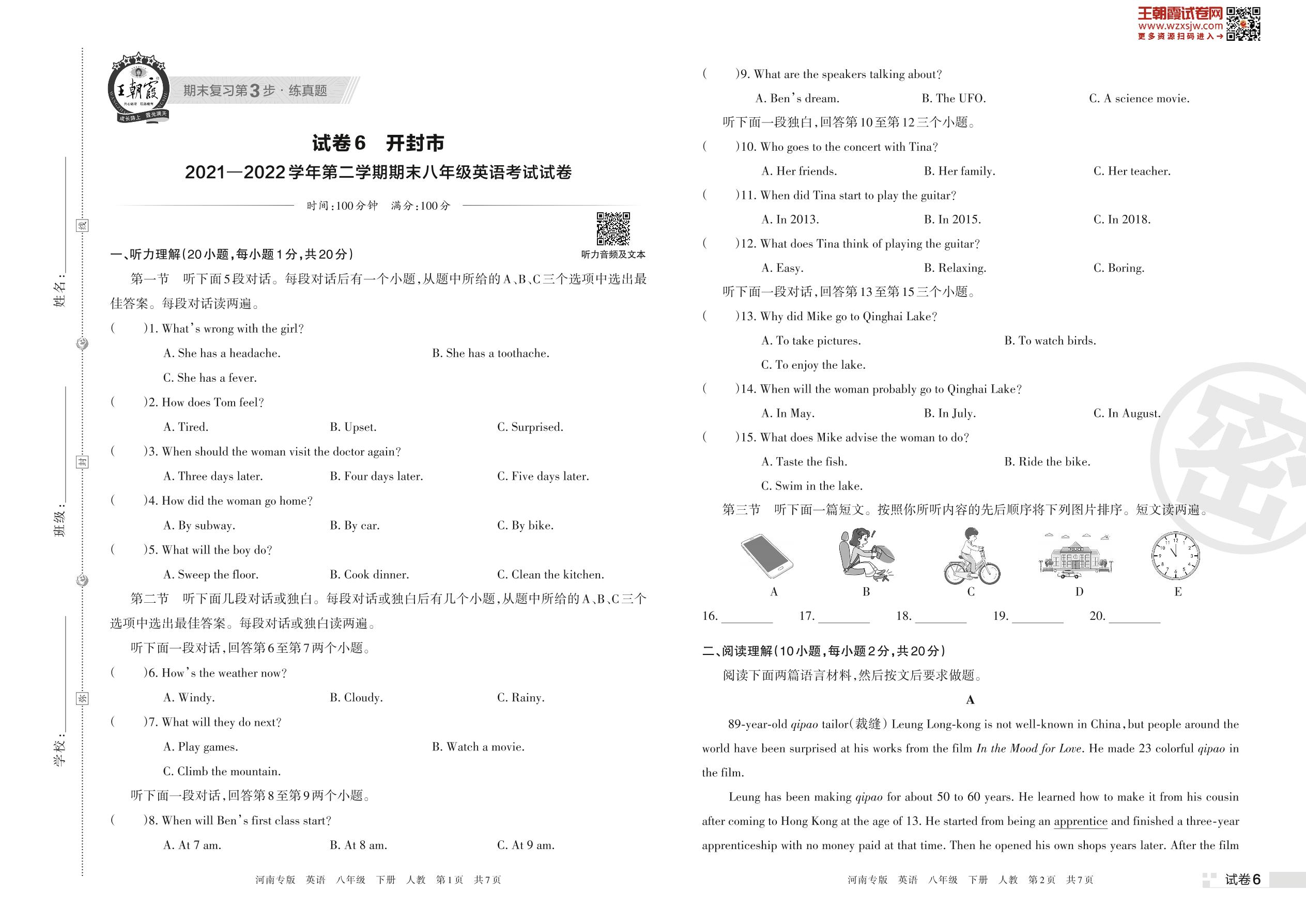 开封市2021—2022学年第二学期期末八年级英语考试试卷(人教版)【6】