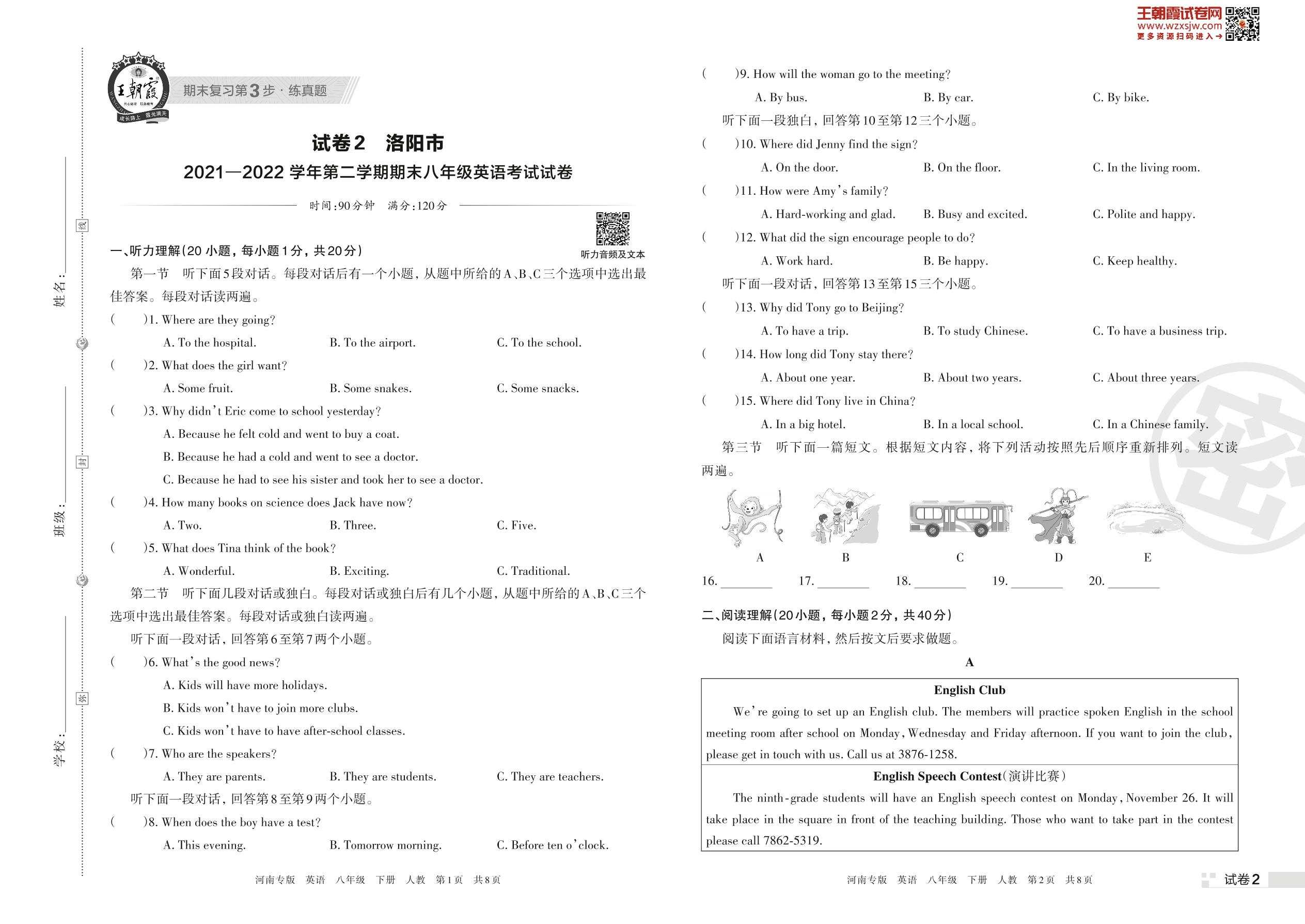 洛阳市2021—2022 学年第二学期期末八年级英语考试试卷(人教版)【2】