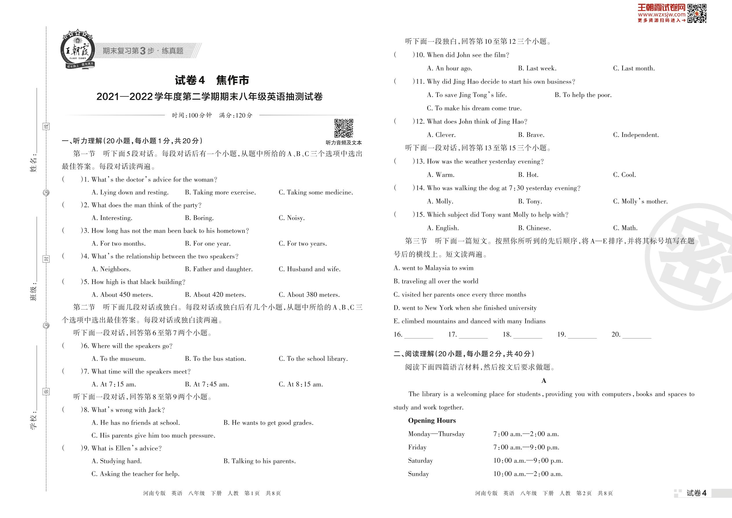 焦作市2021—2022学年度第二学期期末八年级英语抽测试卷(人教版)【4】
