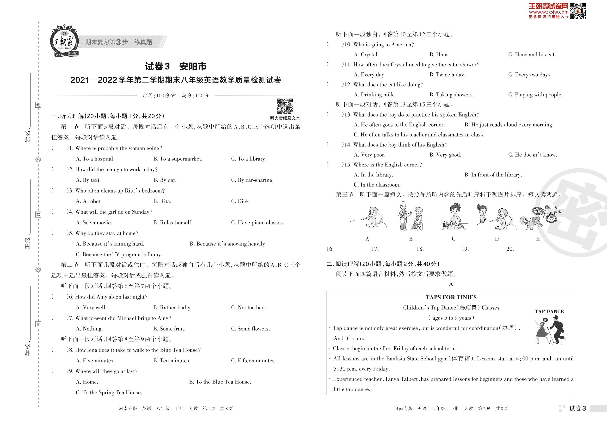 安阳市2021—2022学年第二学期期末八年级英语教学质量检测试卷(人教版)【3】
