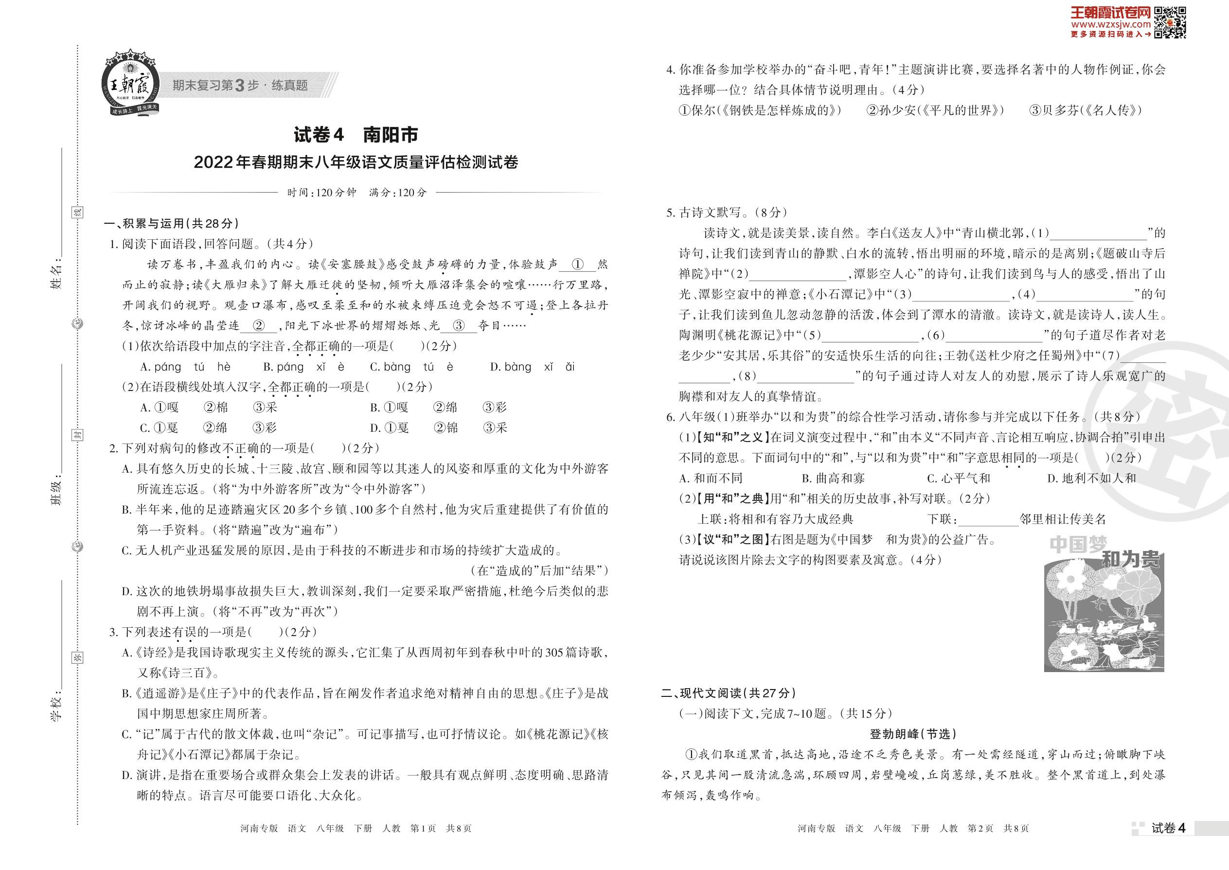 南阳市2022年春期期末八年级语文质量评估检测试卷(人教版)【4】