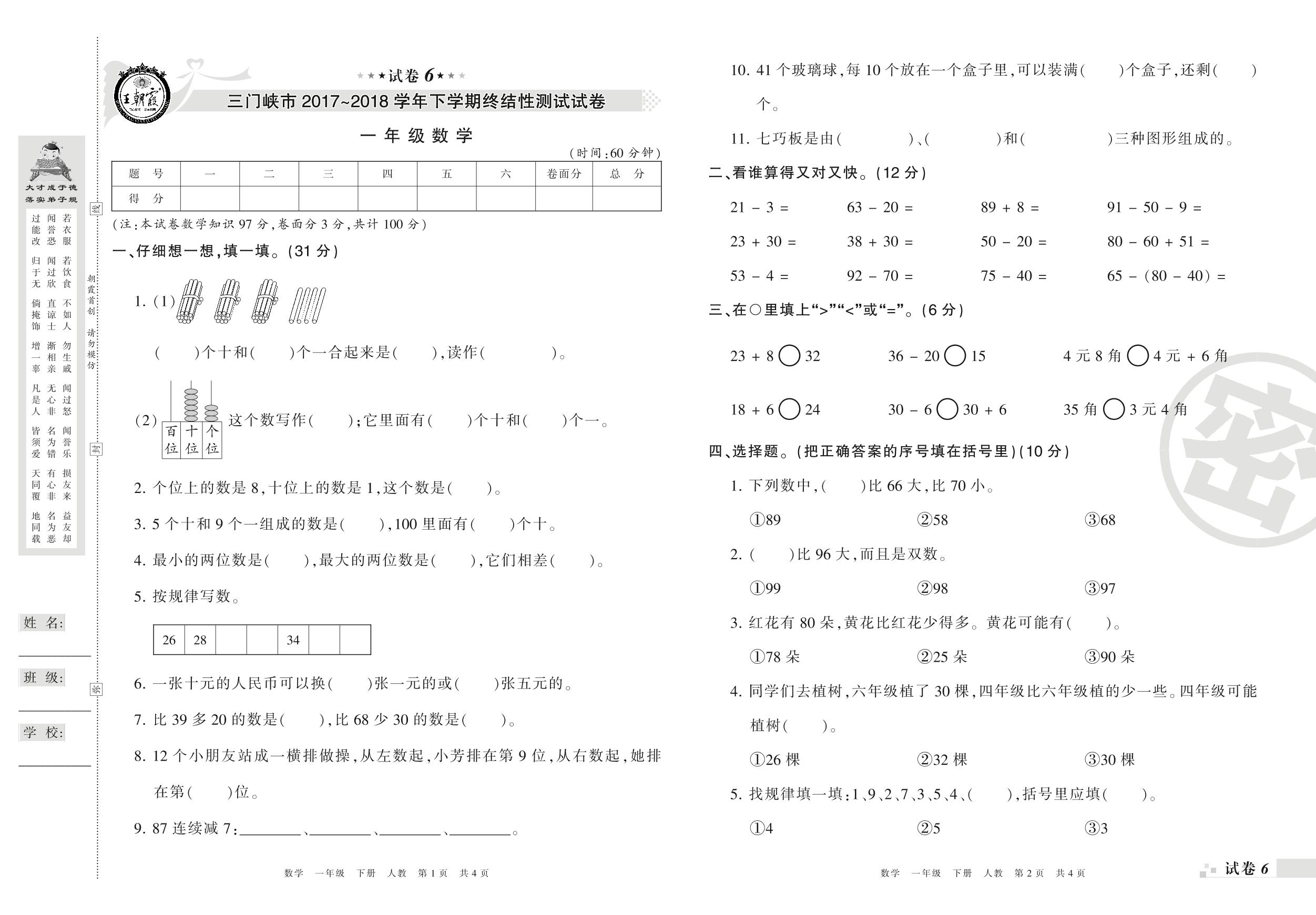 2017-2018学年第二学期三门峡市一年级数学试卷(人教版)【6】