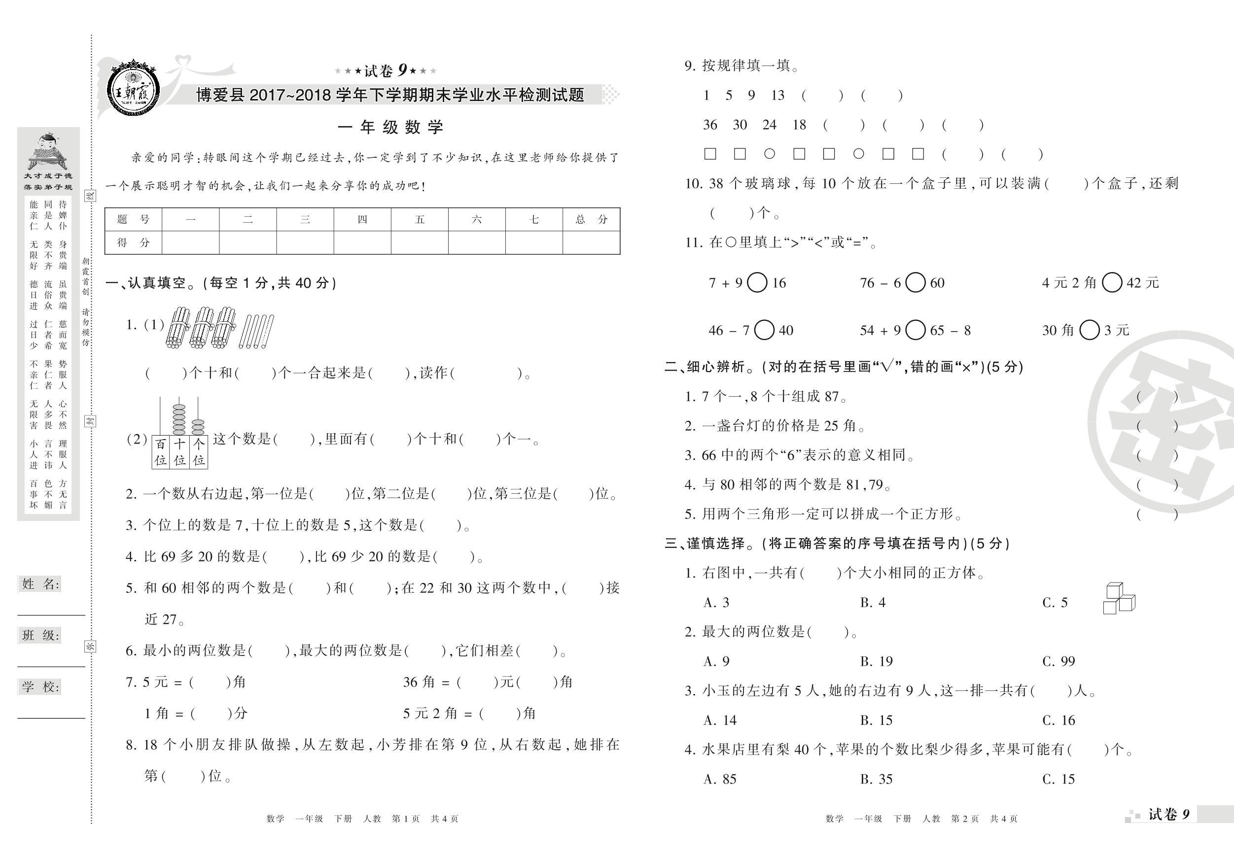 2017-2018学年第二学期焦作市博爱县一年级数学试卷(人教版)【9】
