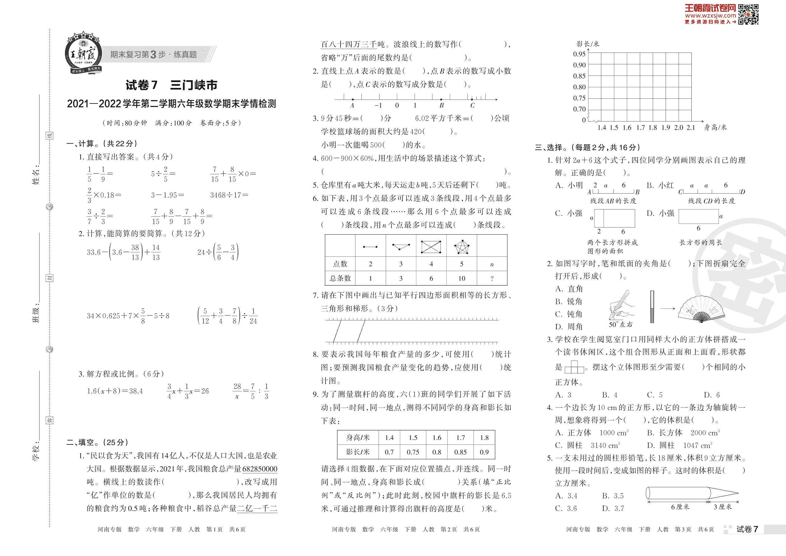 三门峡市2021—2022学年第二学期六年级数学期末学情检测(人教版)【7】