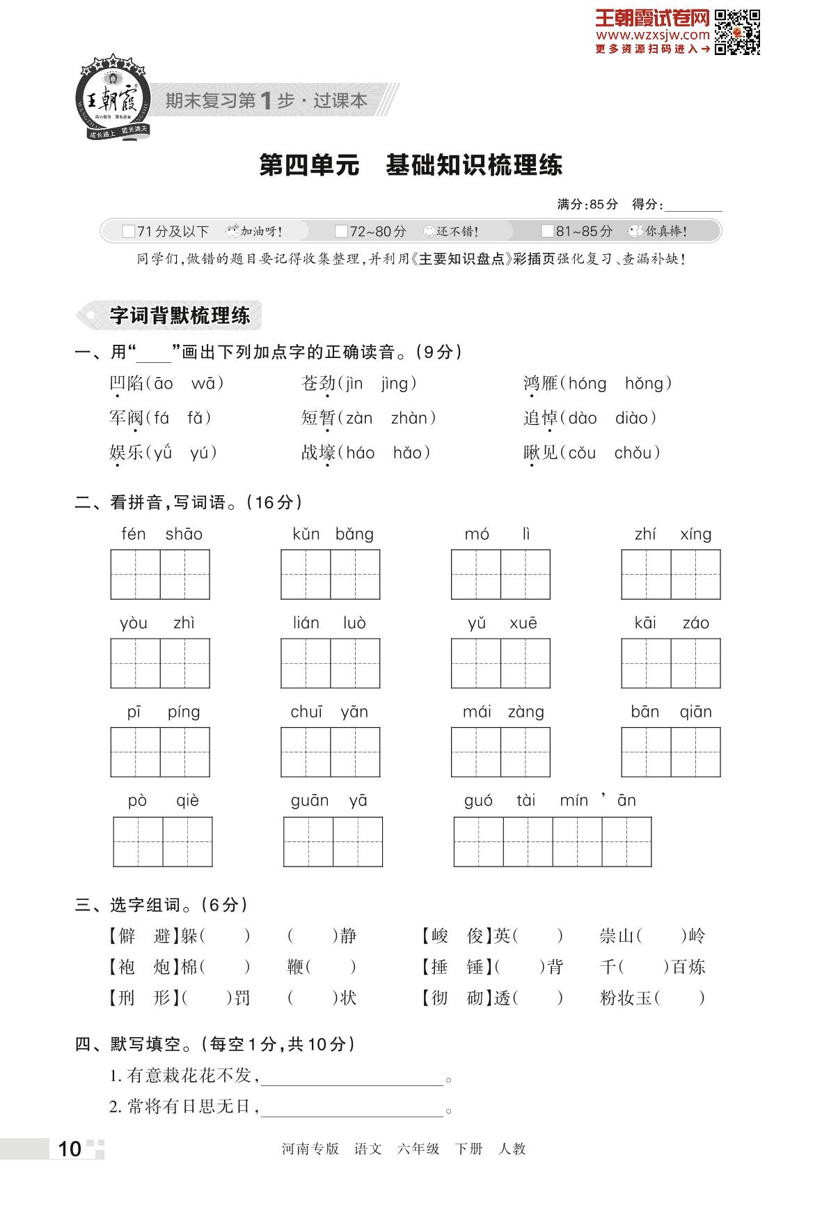 王朝霞期末过课本——第四单元 基础知识梳理练六年级下册语文(人教版)_R230426105432857