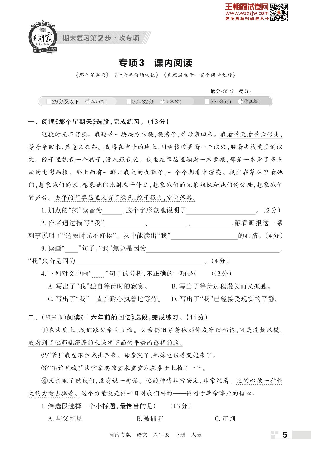 王朝霞期末专项卷——课内阅读六年级下册语文(人教版)_R230426105433253【3】