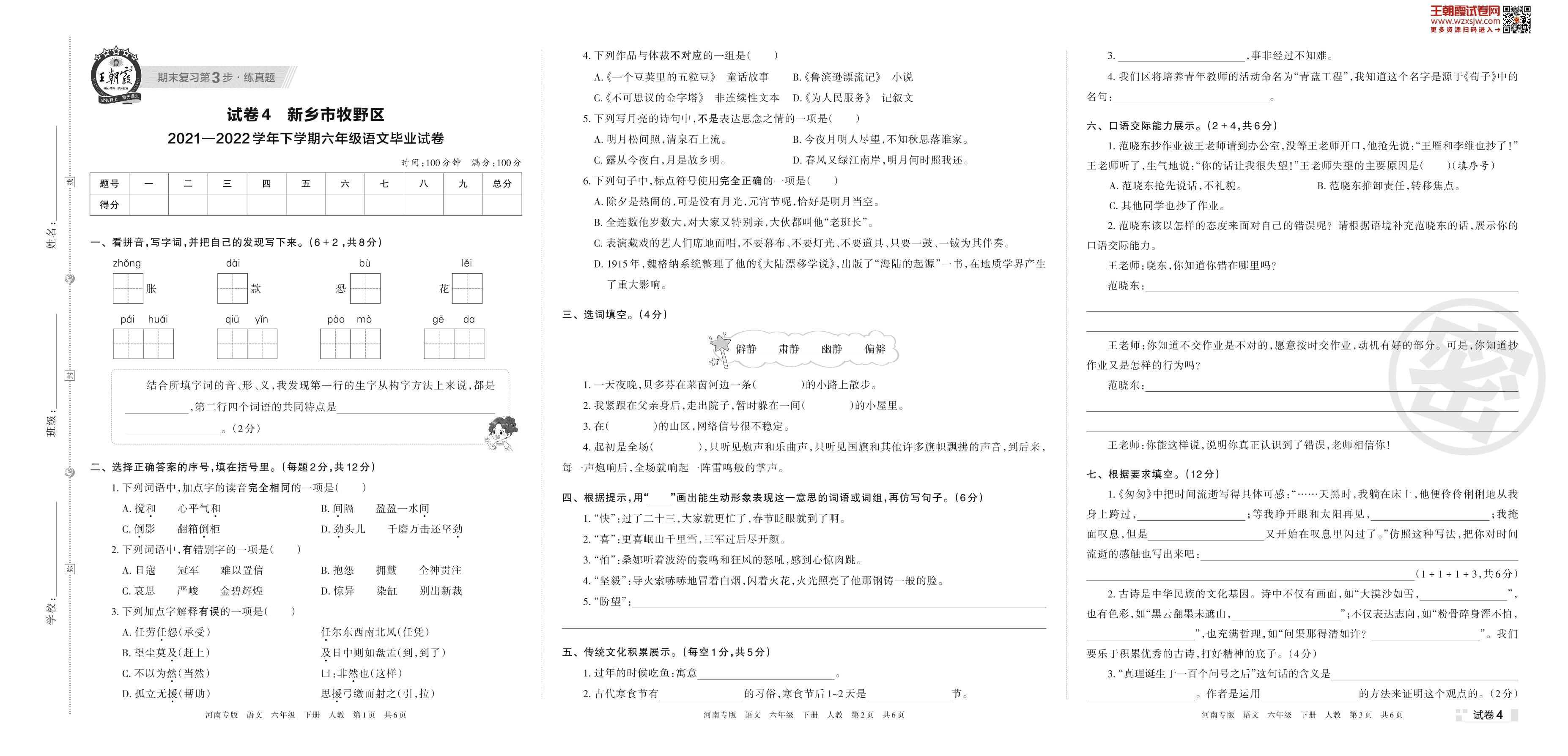新乡市牧野区2021—2022学年下学期六年级语文毕业试卷六年级下册语文(人教版)【4】