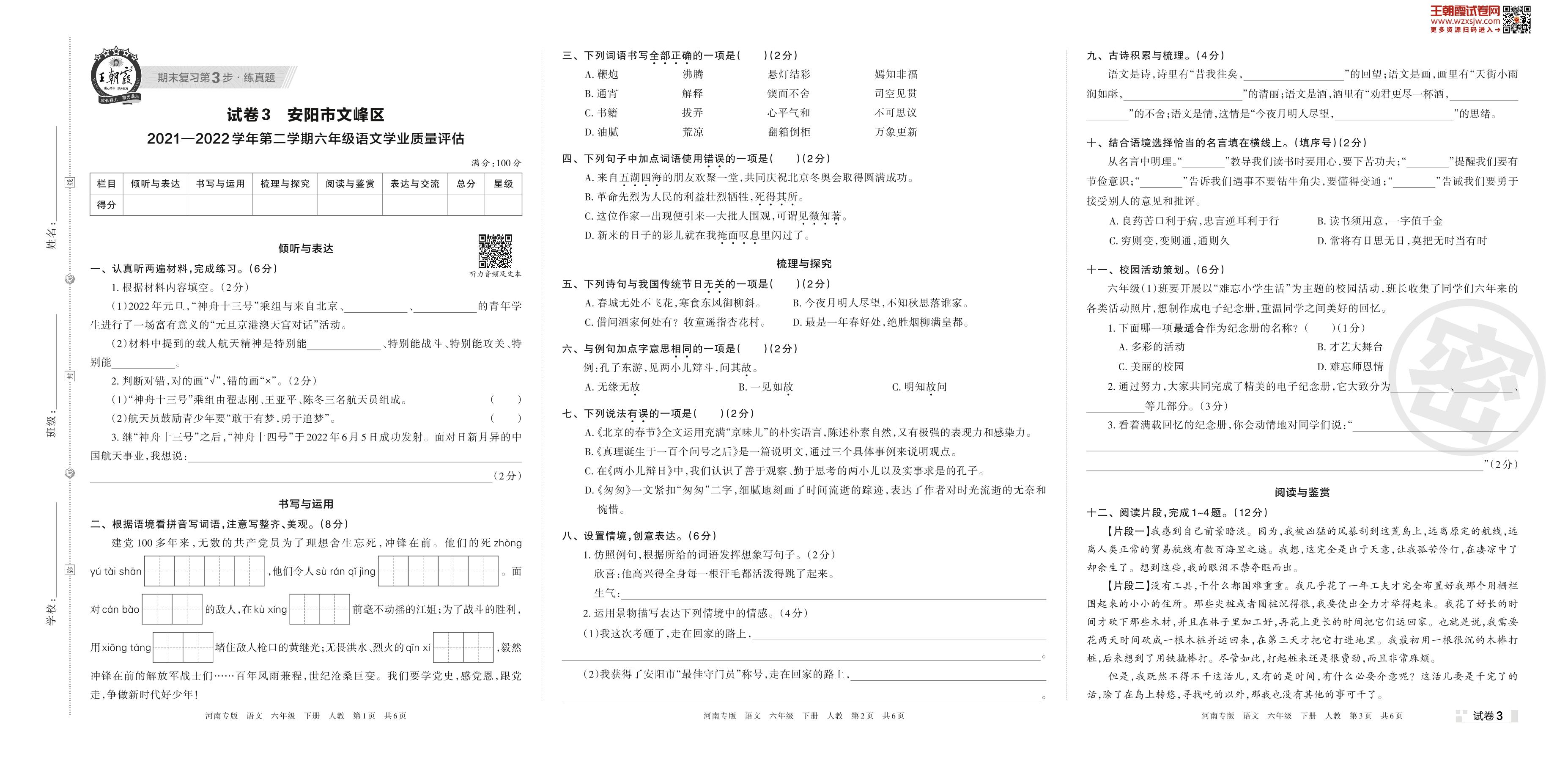 安阳市文峰区2021—2022学年第二学期六年级语文学业质量评估六年级下册语文(人教版)【3】