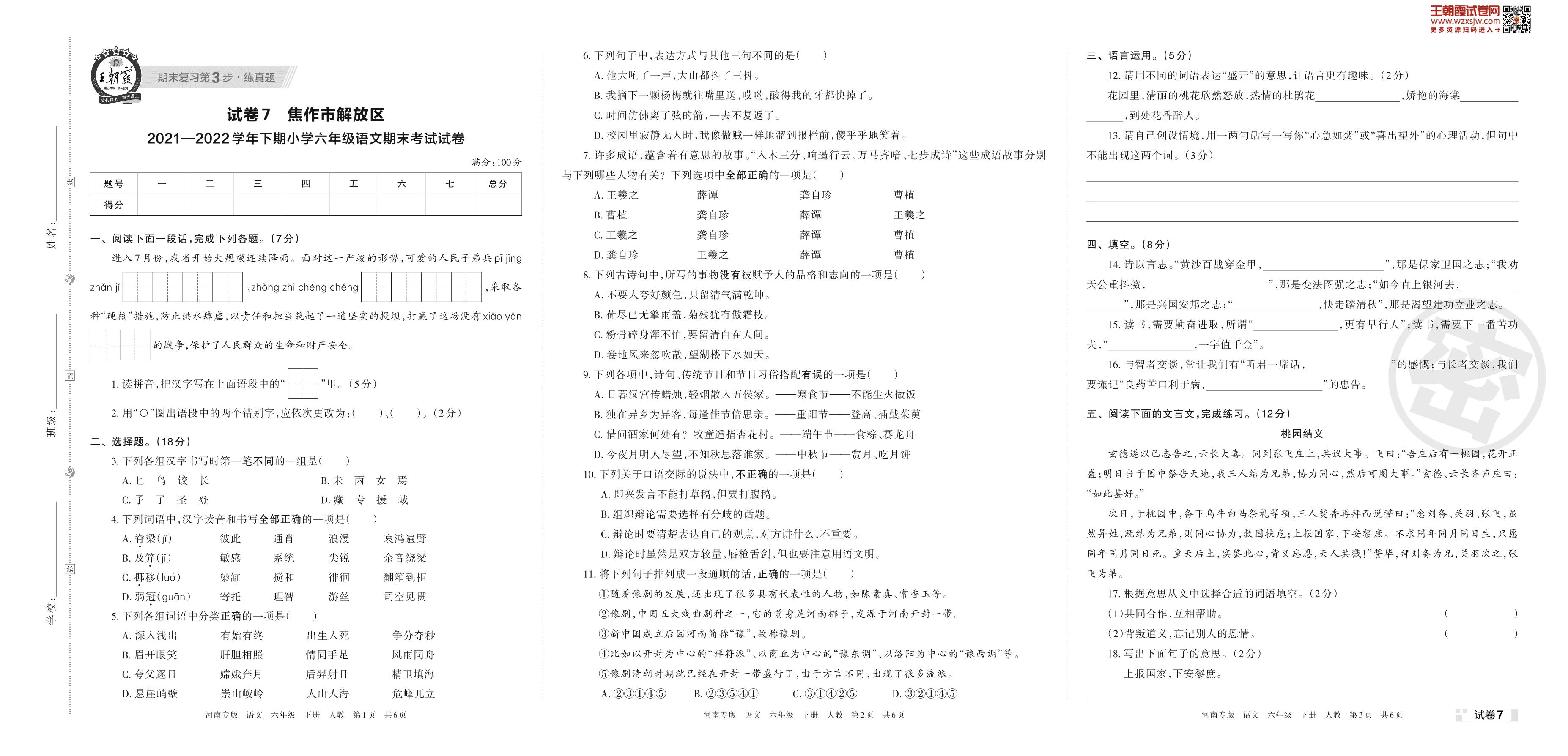 焦作市解放区2021—2022学年下期小学六年级语文期末考试试卷六年级下册语文(人教版)【7】
