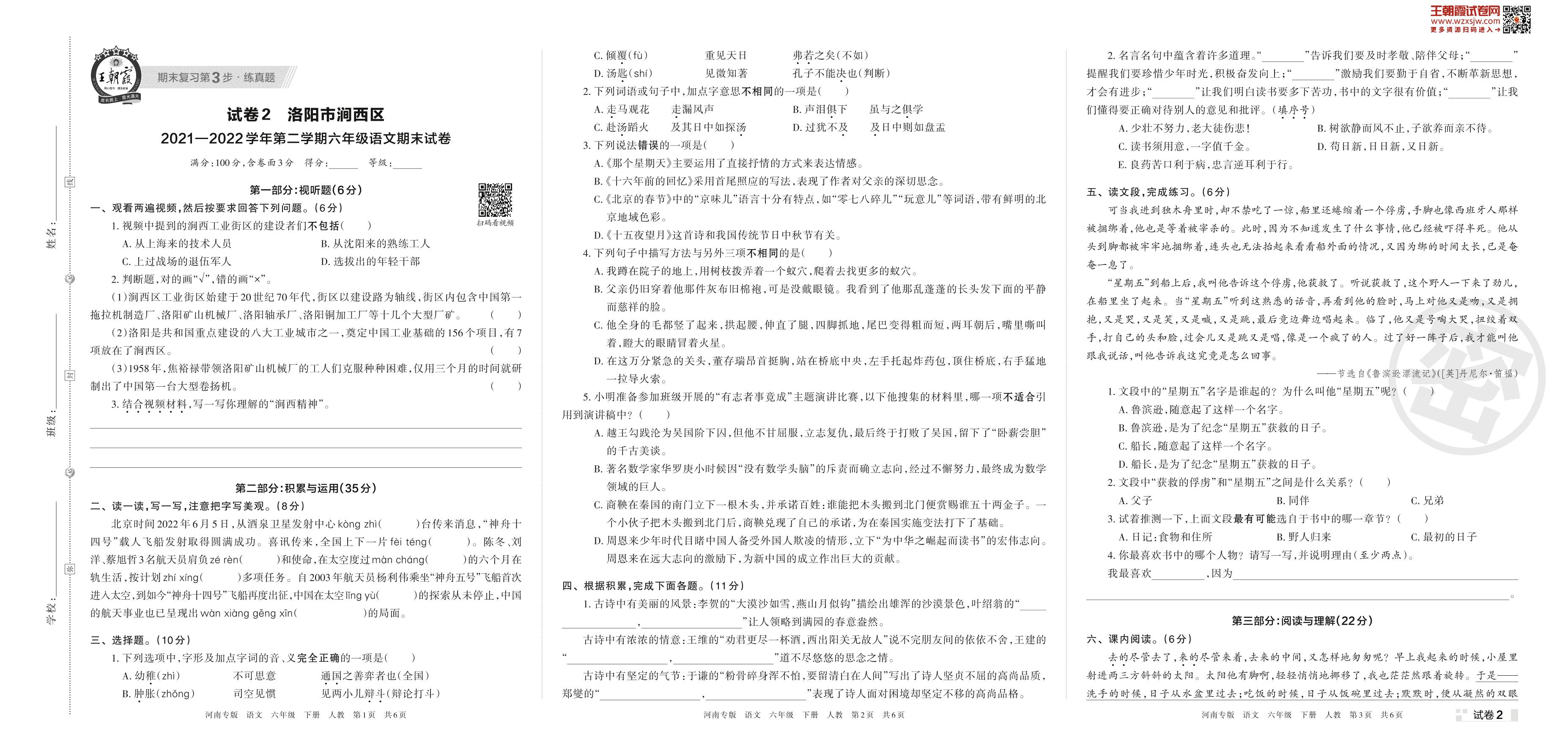 洛阳市涧西区2021—2022学年第二学期六年级语文期末试卷六年级下册语文(人教版)【2】