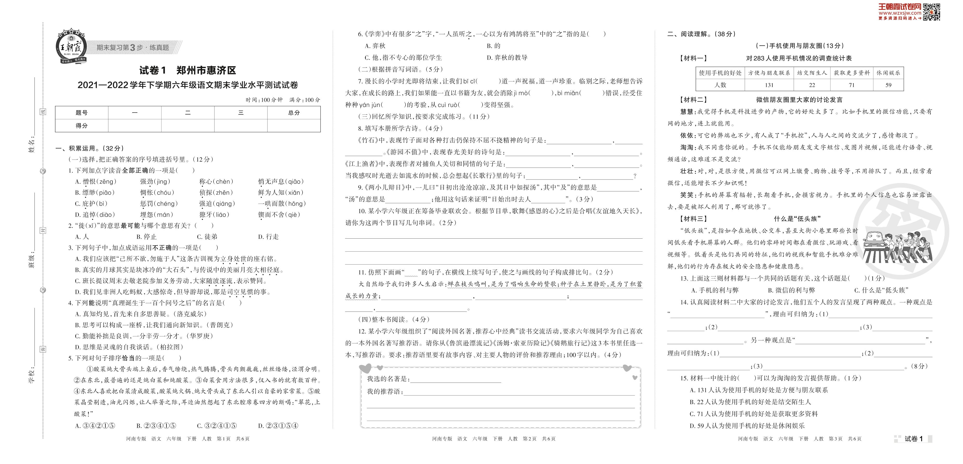 郑州市惠济区2021—2022学年下学期六年级语文期末学业水平测试试卷六年级下册语文(人教版)【1】