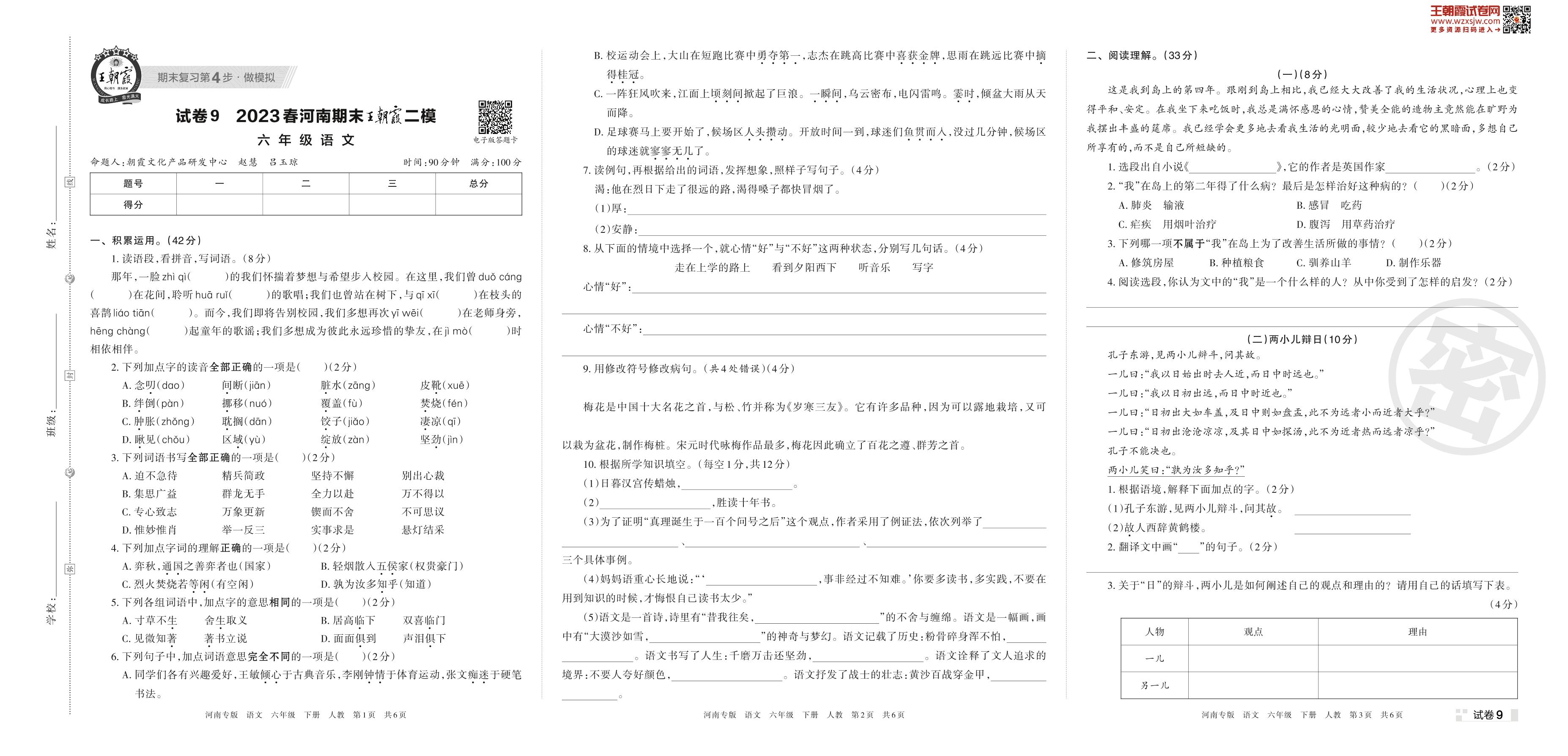王朝霞期末模拟卷六年级下册语文(人教版)_R230426105434209【9】