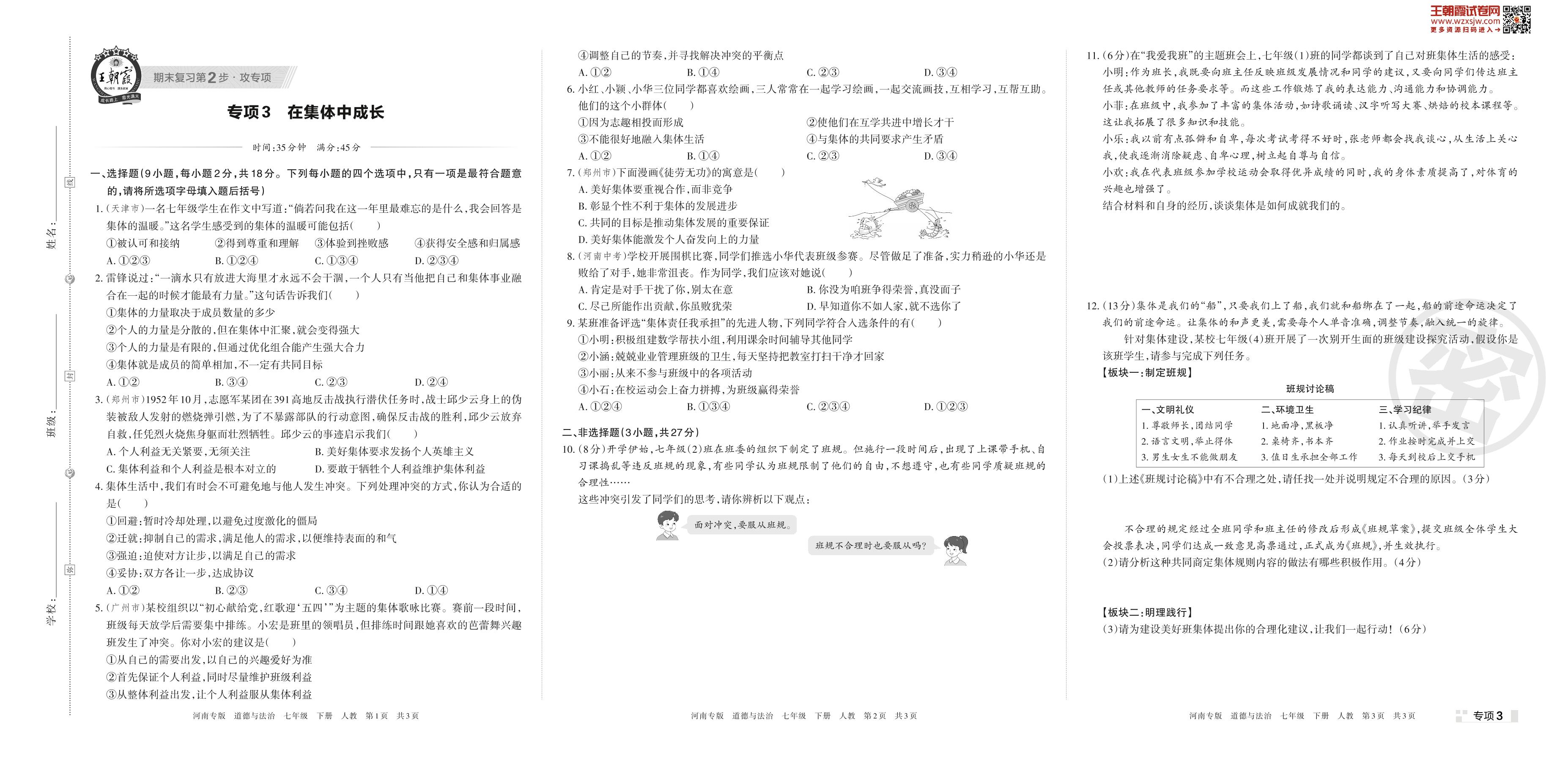 王朝霞期末专项卷——在集体中成长七年级下册道德与法治(人教版)_R230426110147600【3】